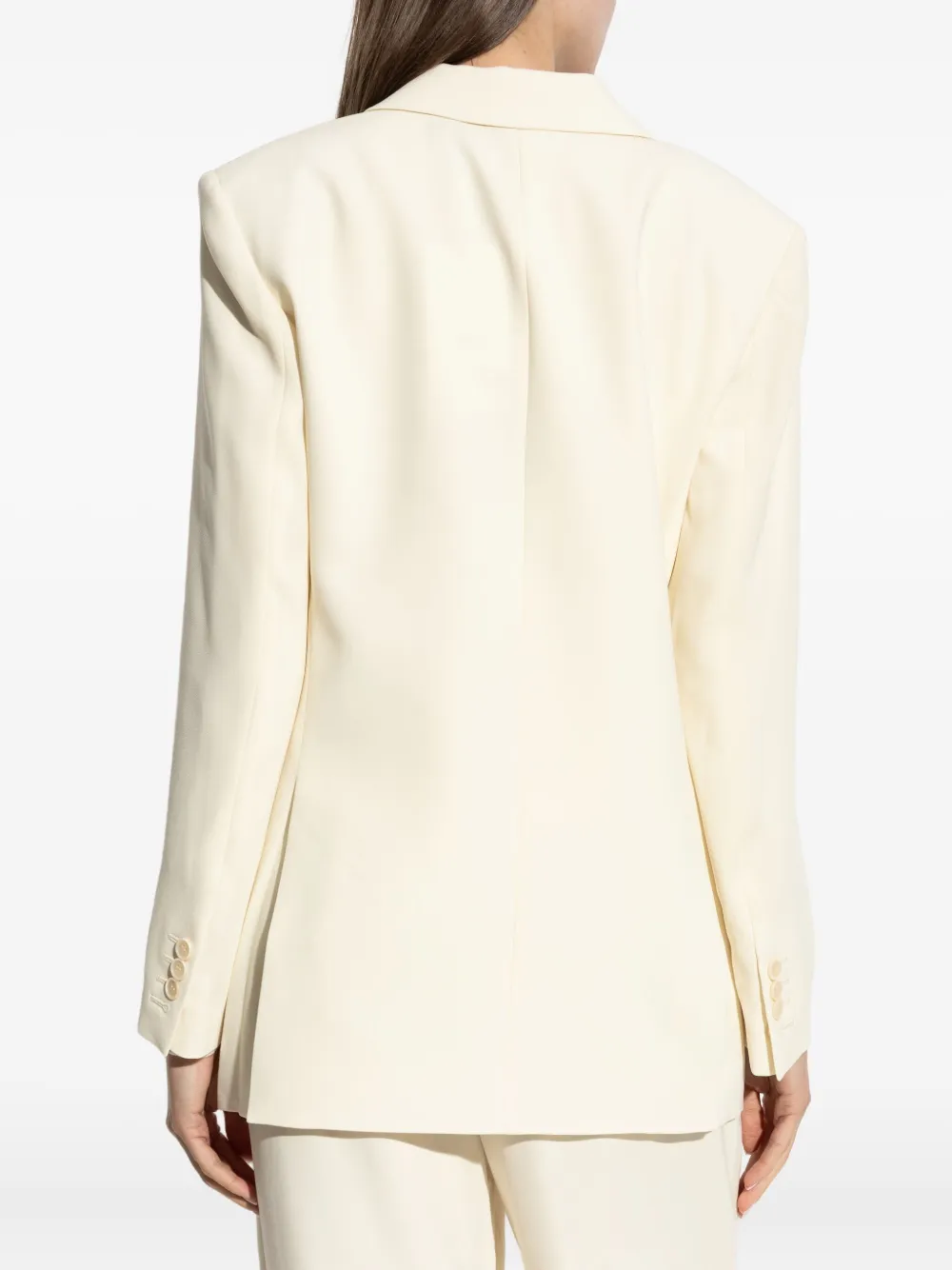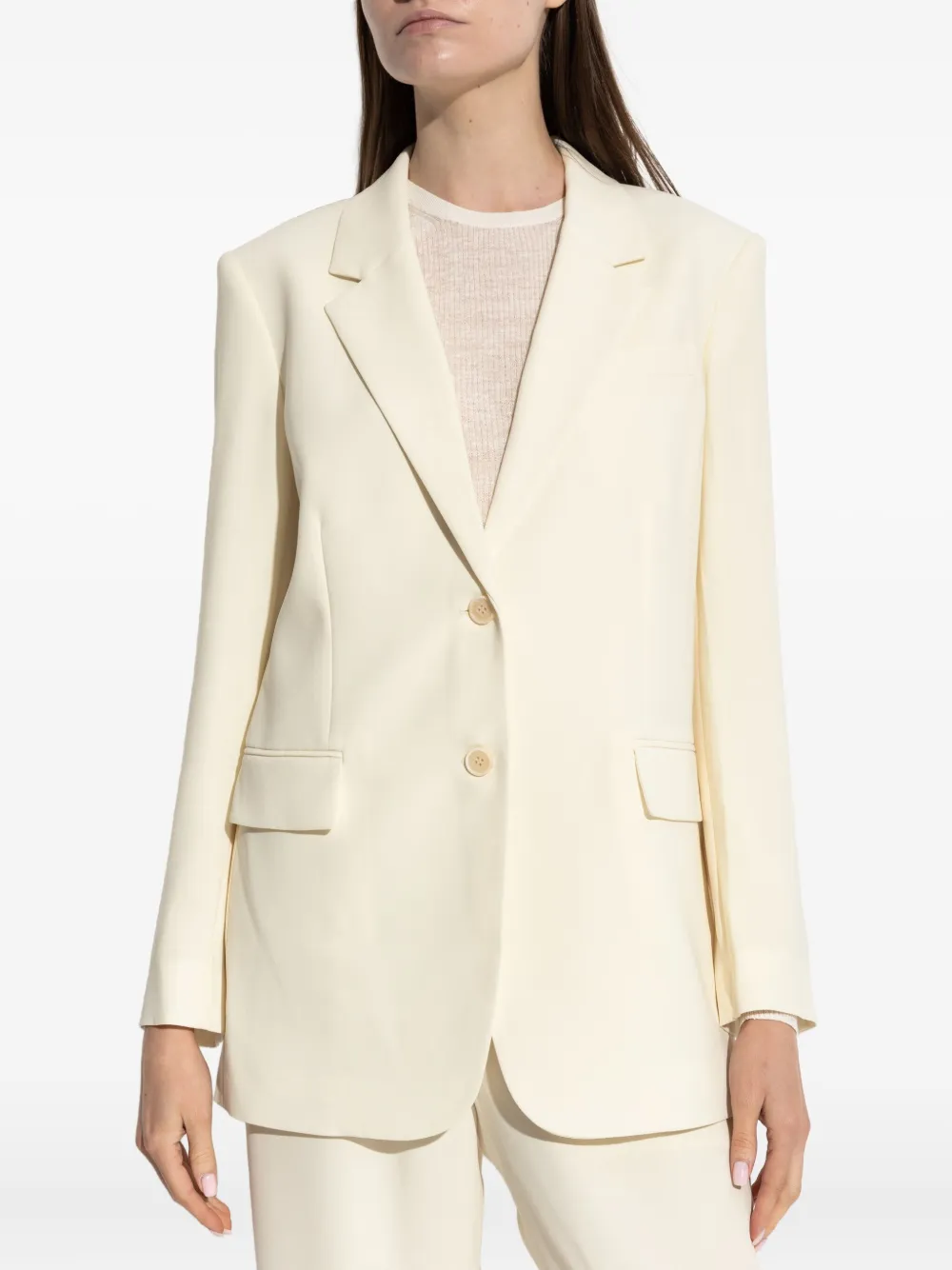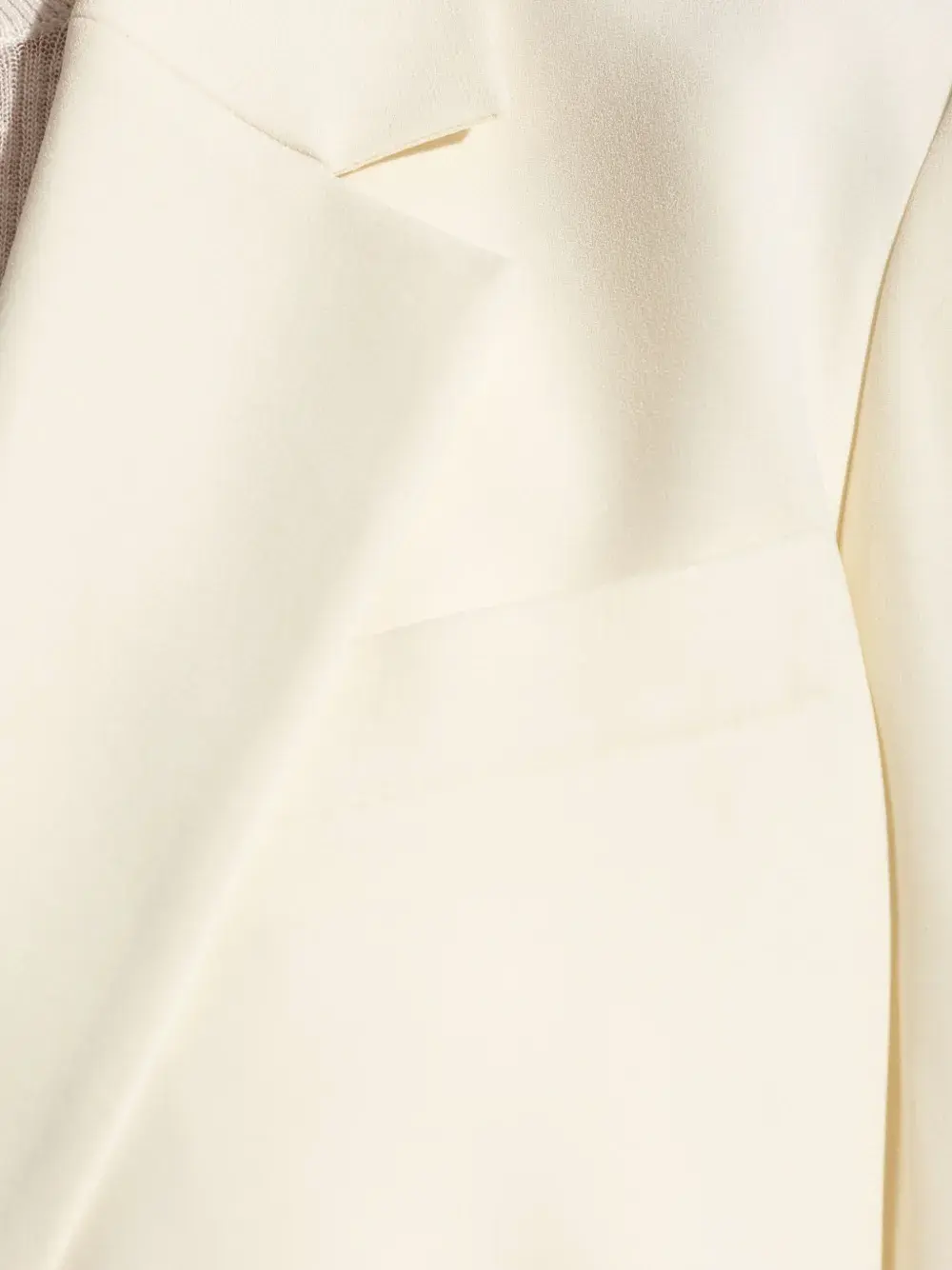 Кремовый, с заостренными лацканами, застежкой на пуговицы, длинными рукавами, карманами с клапанами
