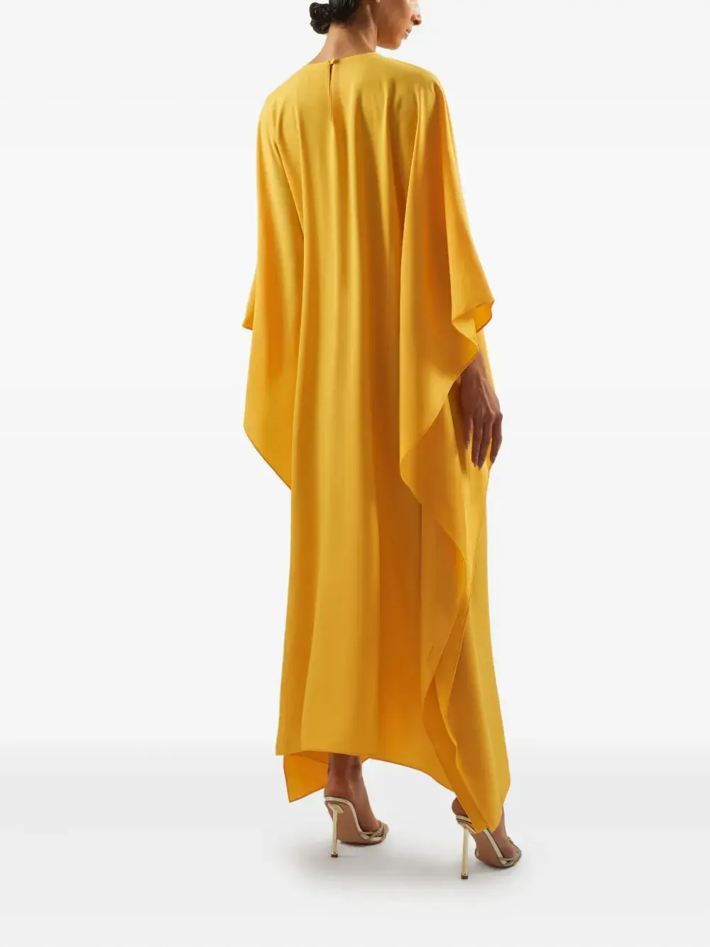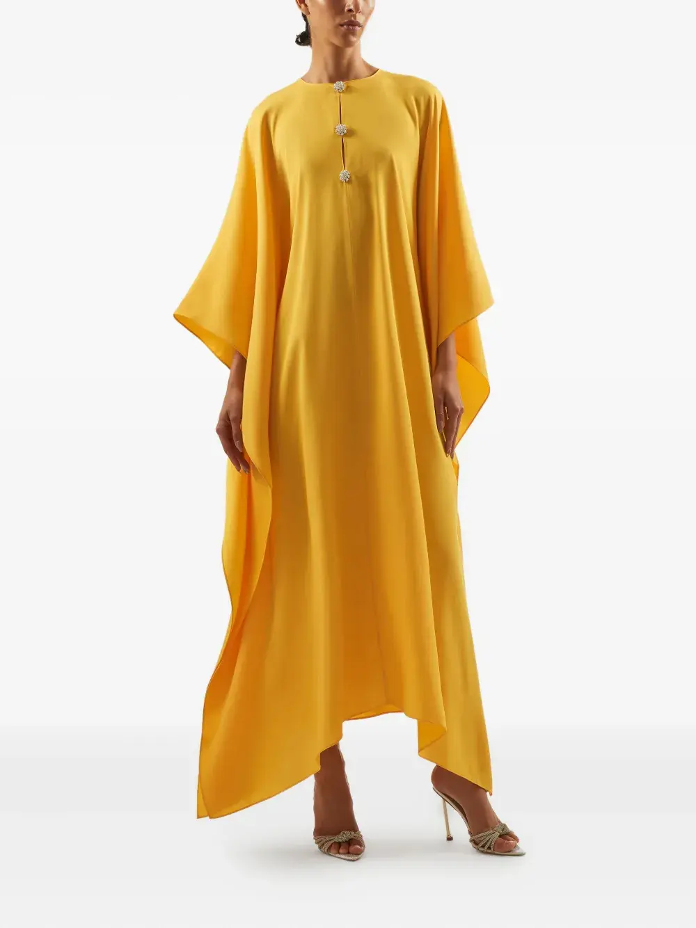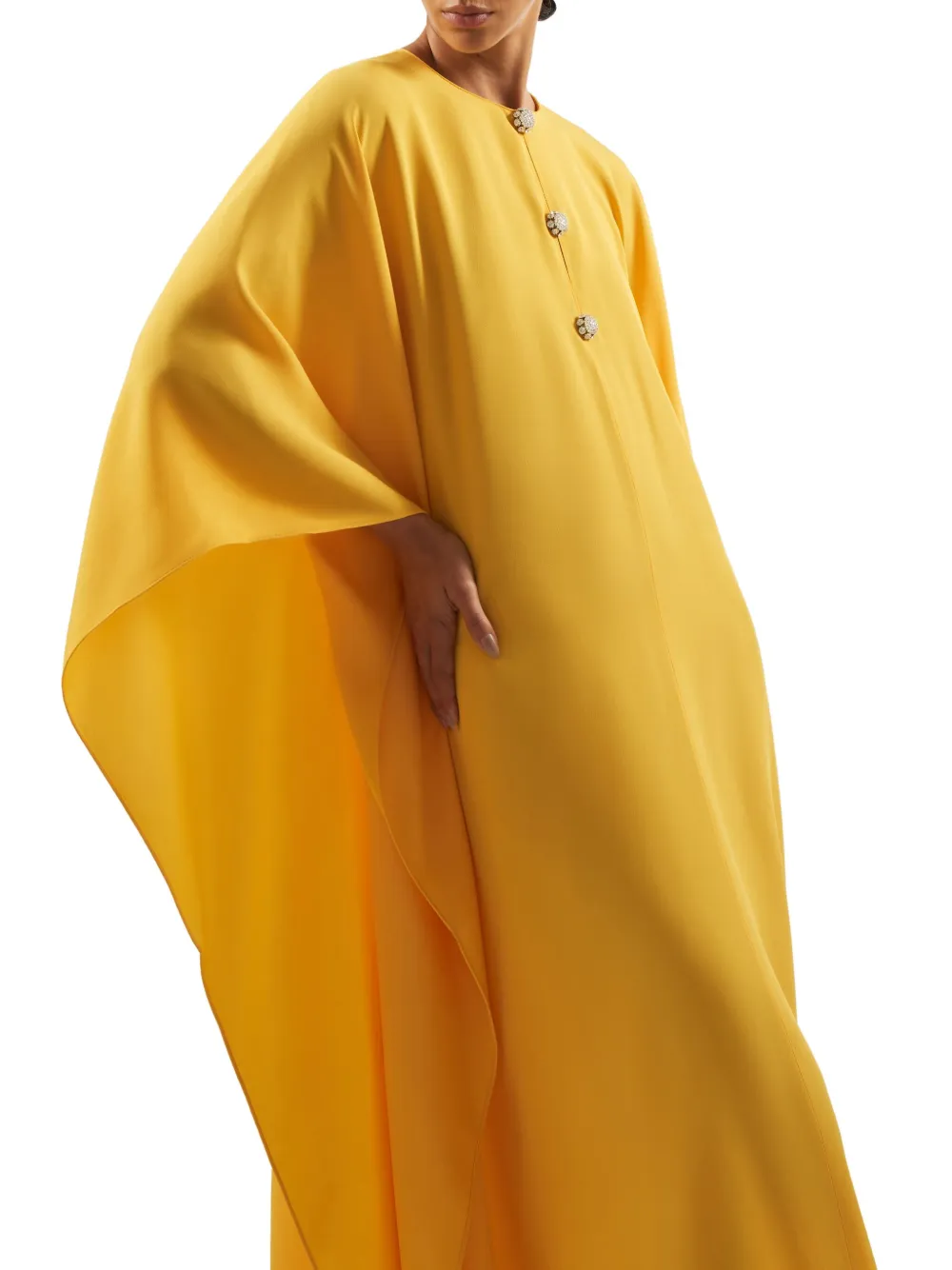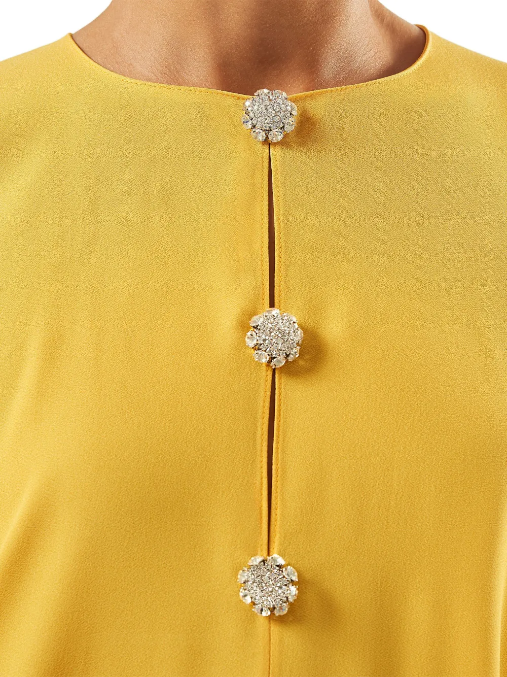 Желтые рукава «летучая мышь», украшенные кристаллами пуговицы, круглый вырез, асимметричный подол, свободный крой