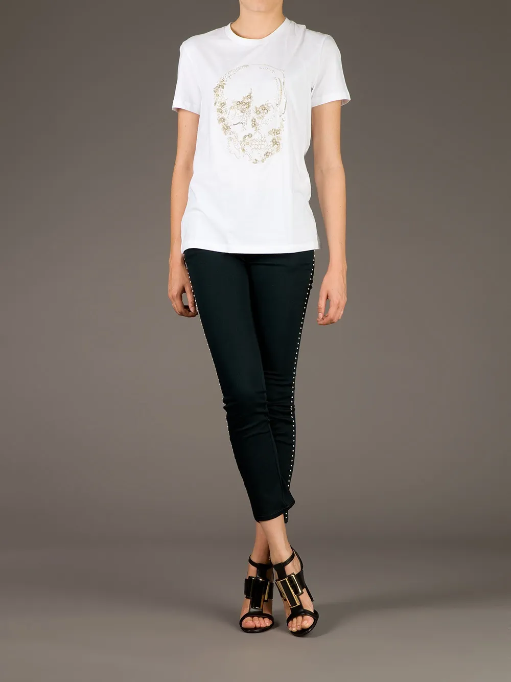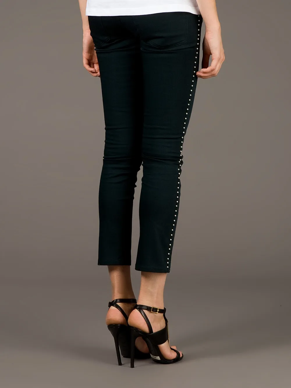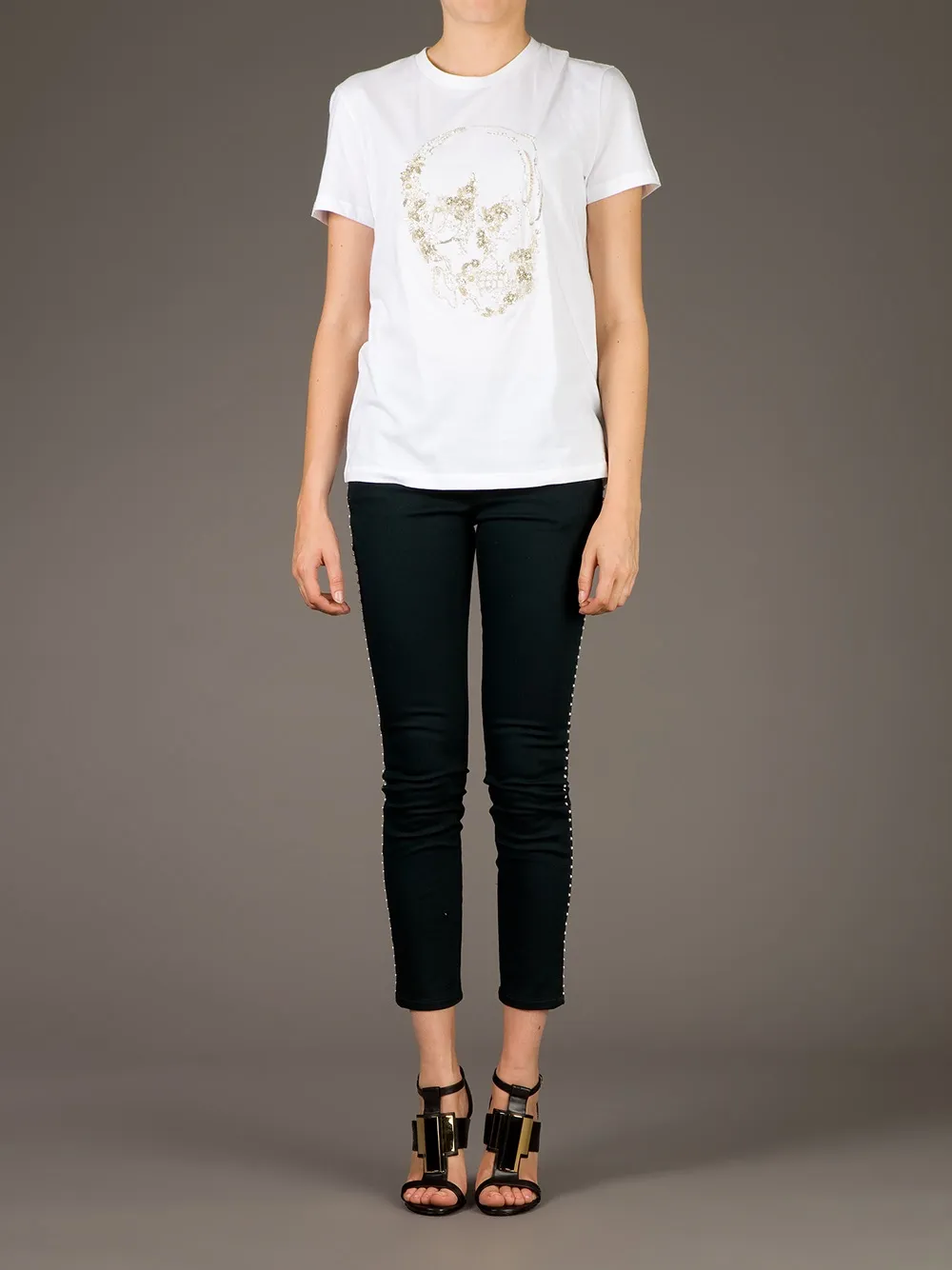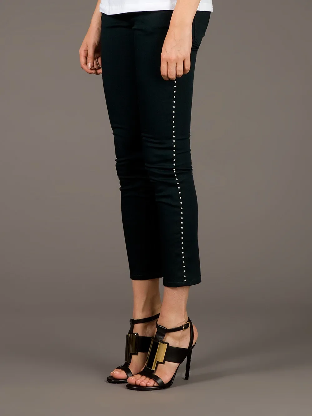 Cropped beaded trouser от Alexander McQueen (Александр Маккуин). Узкий крой, укороченная длина, пояс с петлями для ремня, застежка на пуговицы и классическая пятикарманная модель.