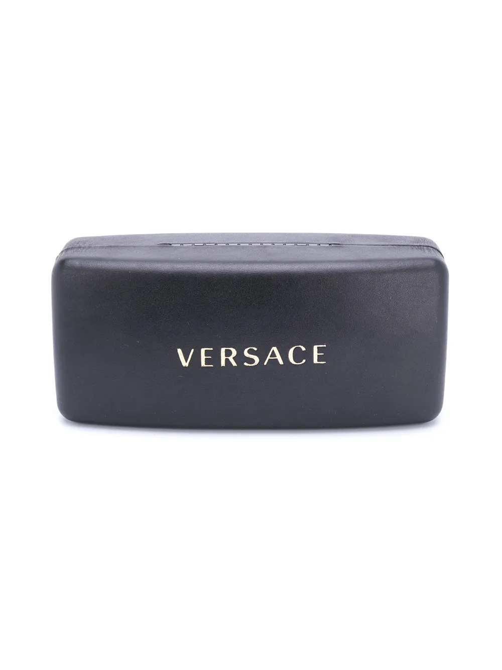 Солнцезащитные очки в овальной оправе от Versace Eyewear. Темные линзы, прямые дужки с остро изогнутыми концами, логотип бренда на внешней стороне дужки и золотистая фурнитура. Прилагается защитный чехол.