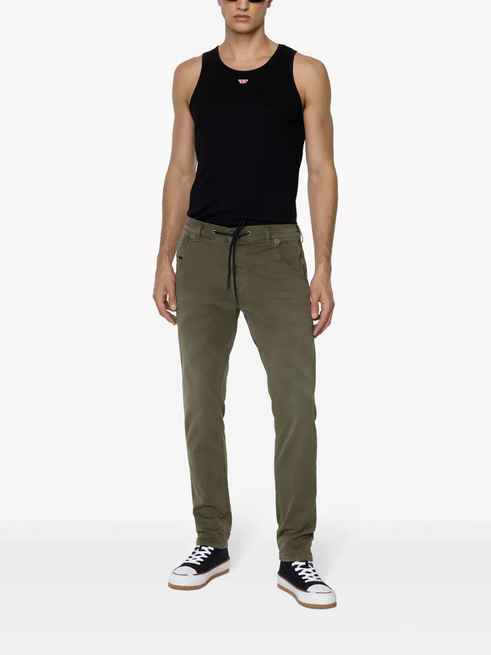 Джинсы Krooley с заниженной талией от Diesel (Дизель). Вышитый логотип спереди, кулиска на талии, передние карманы, задние карманы и сужающиеся к низу брючины.