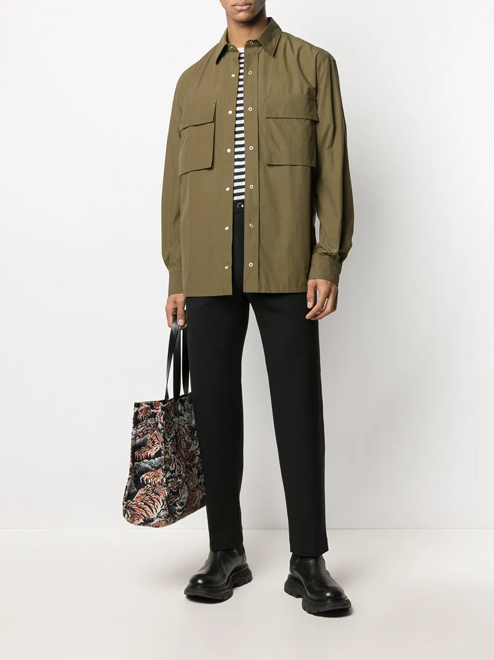 Вышитый логотип на рукаве, классический воротник, рукава с манжетами на пуговицах, два накладных кармана на груди и застежка на пуговицах спереди.