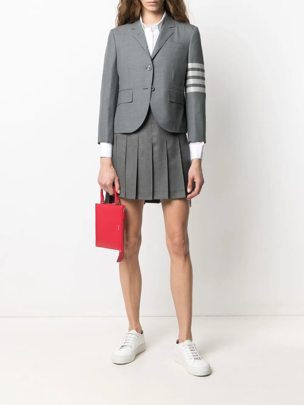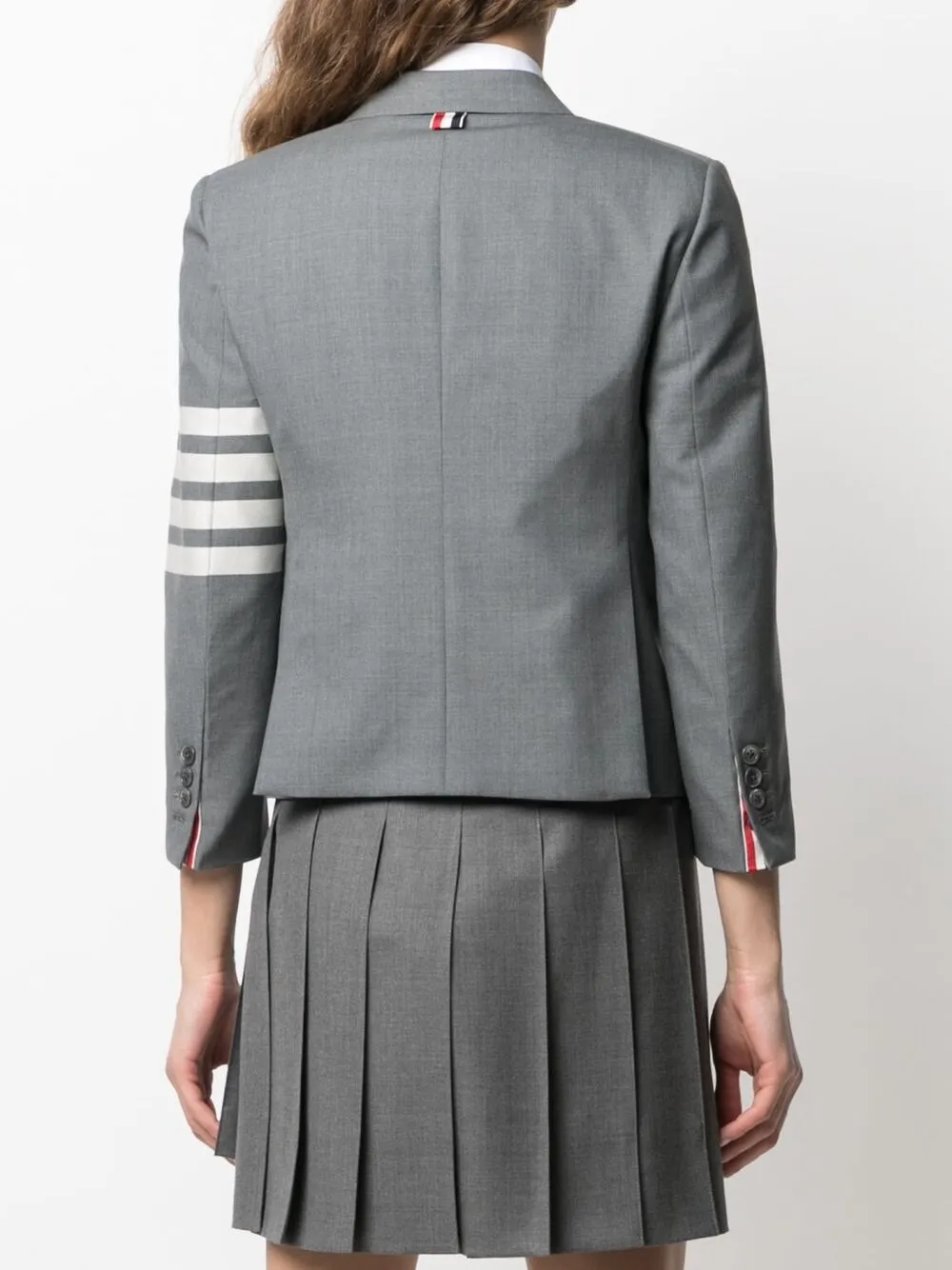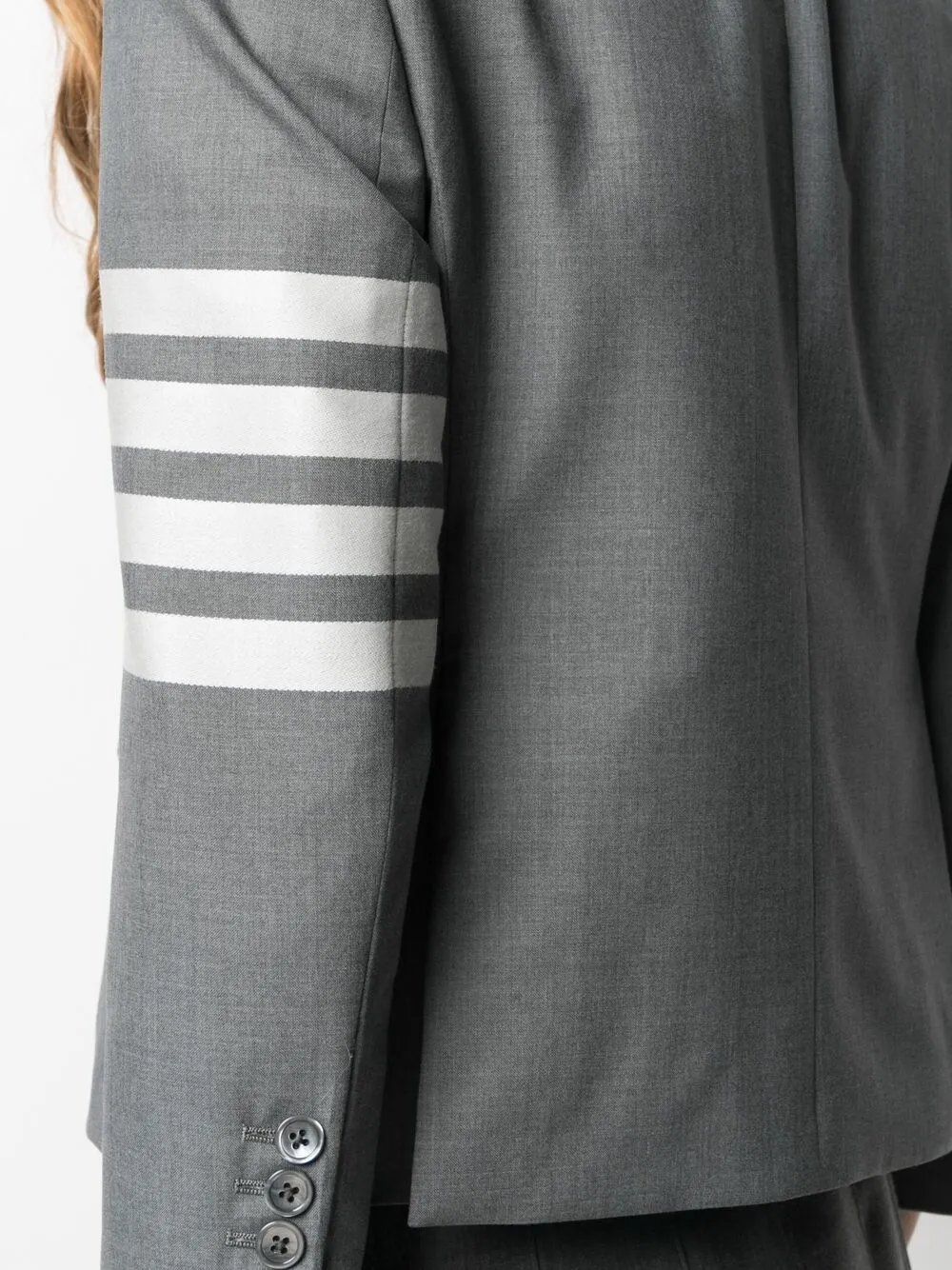 Полоски 4-Bar, зазубренные лацканы, нагрудный прорезной карман, длинные рукава, манжеты на пуговицах, два передних кармана с клапанами, две боковые шлицы сзади, подкладка в полоску и укороченная длина. Цвет: серый.