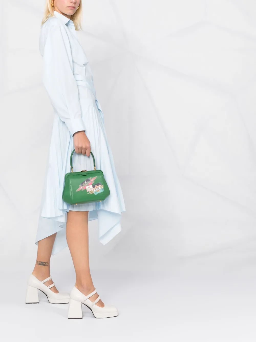Графичный принт, застежка на заклепках, основное отделение, внутренний прорезной карман, закругленная верхняя ручка, съемный регулируемый ремень на плечо и металлические ножки.