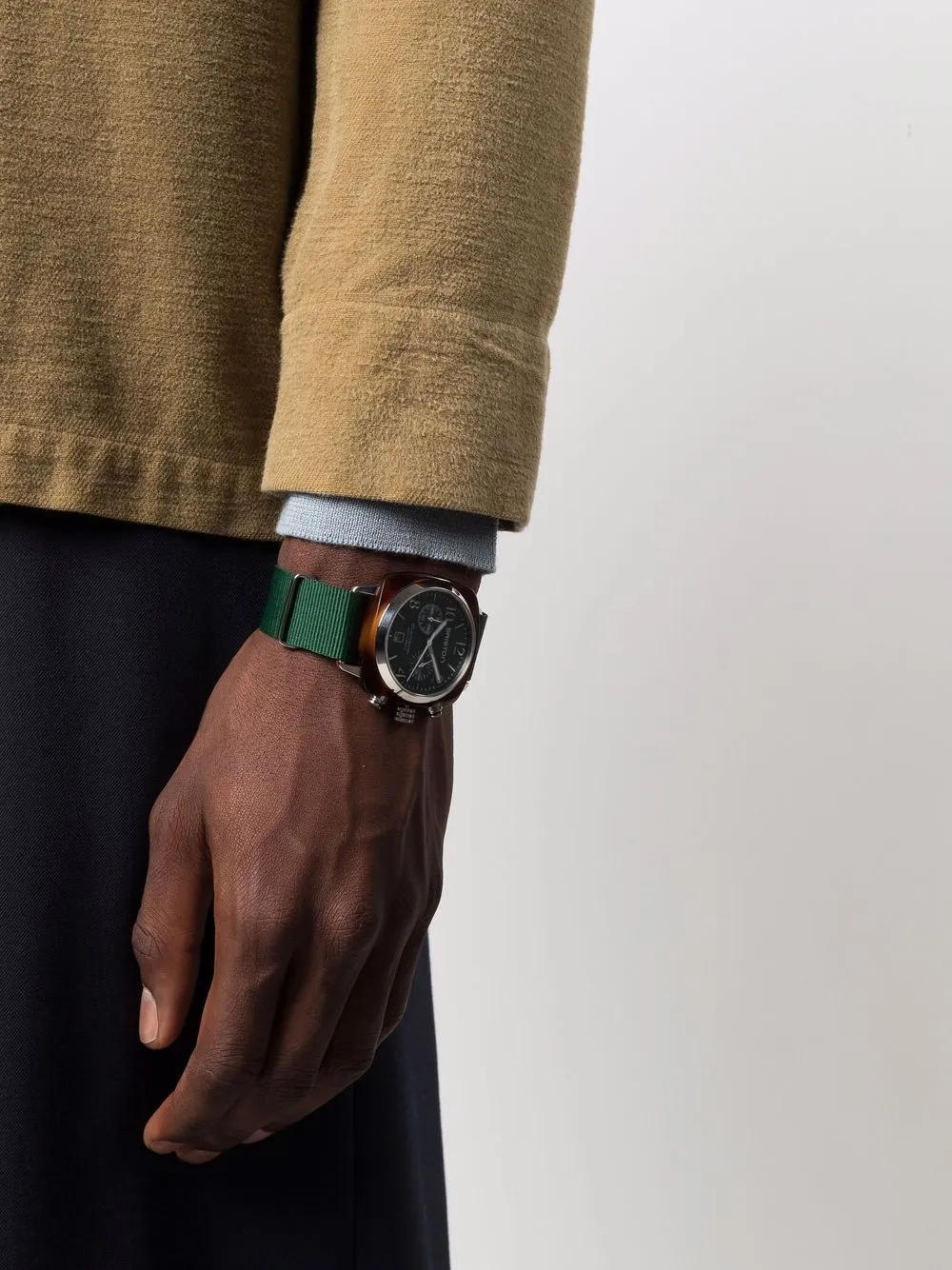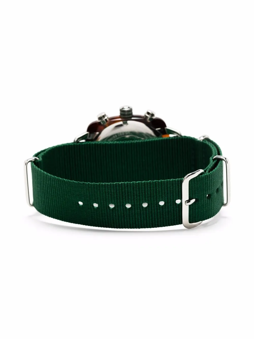 Круглый корпус, автоматический механизм, тканевый ремешок, застежка на пряжке, заостренные стрелки, завинчивающаяся заводная коронка и хронограф. Цвет: зеленый..