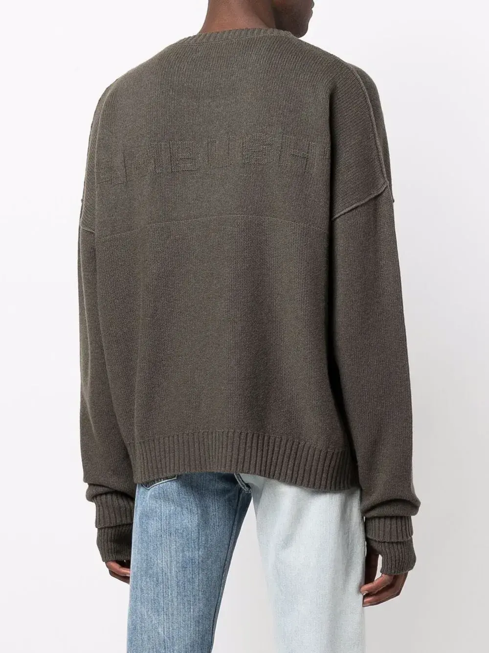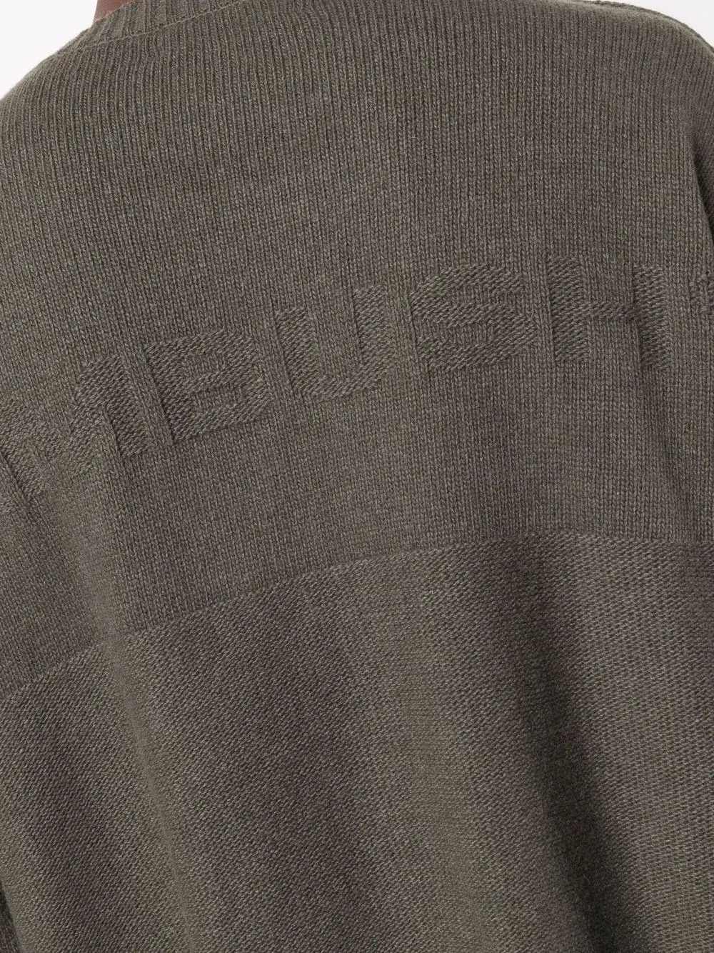 Трикотажный материал, логотип в технике интарсия, вырезные детали, круглый вырез, приспущенные плечи, длинные рукава, манжеты в рубчик и подол в рубчик.