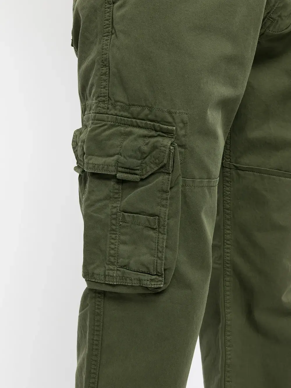 Средняя посадка, петли для ремня, застежка на молнии и пуговице спереди, два прорезных кармана по бокам, два накладных кармана по бокам и два кармана с клапанами сзади.