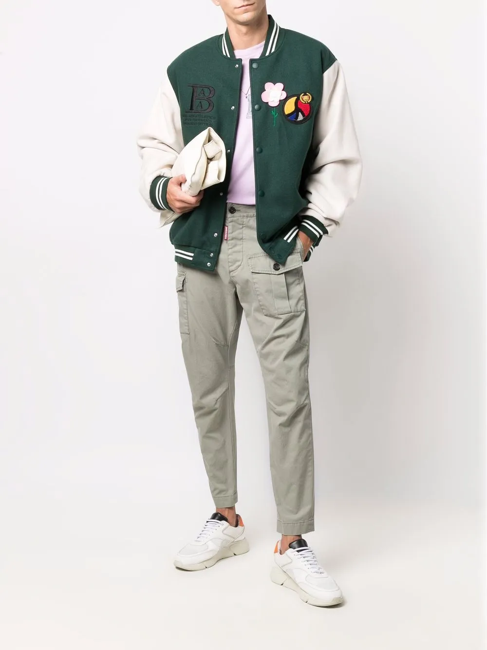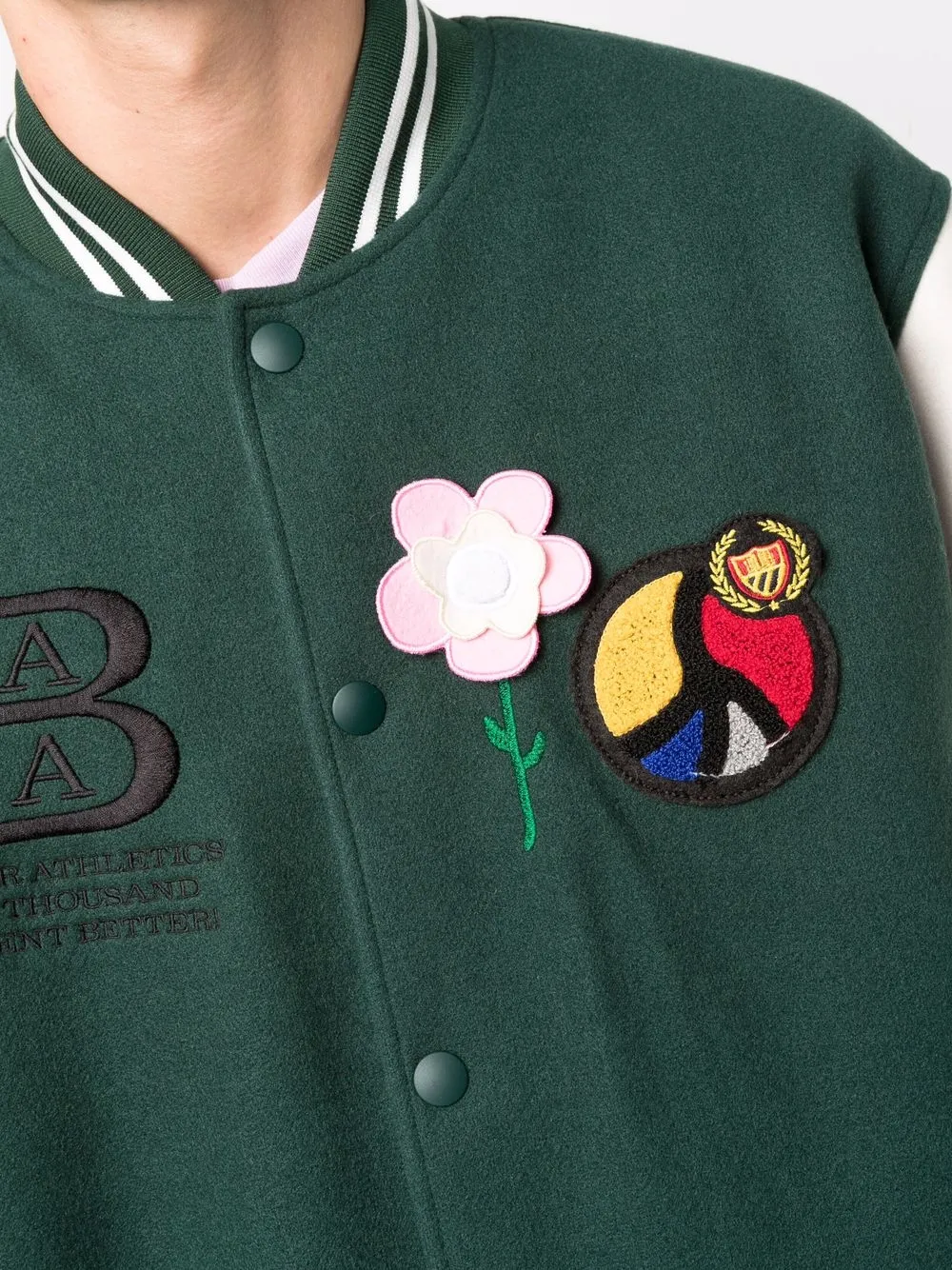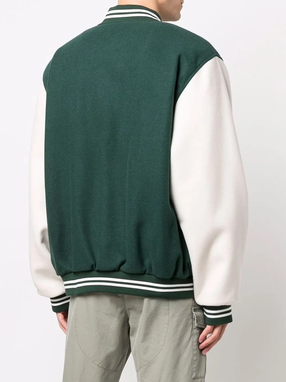 Вышитый логотип спереди, нашивки с логотипом спереди, бейсбольный воротник, застежка на заклепках, длинные рукава и прямой подол. Цвет: зеленый.