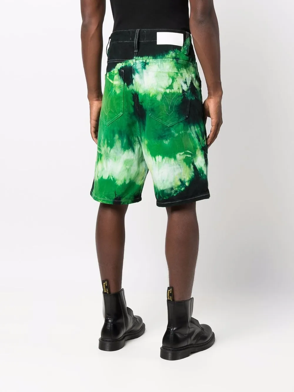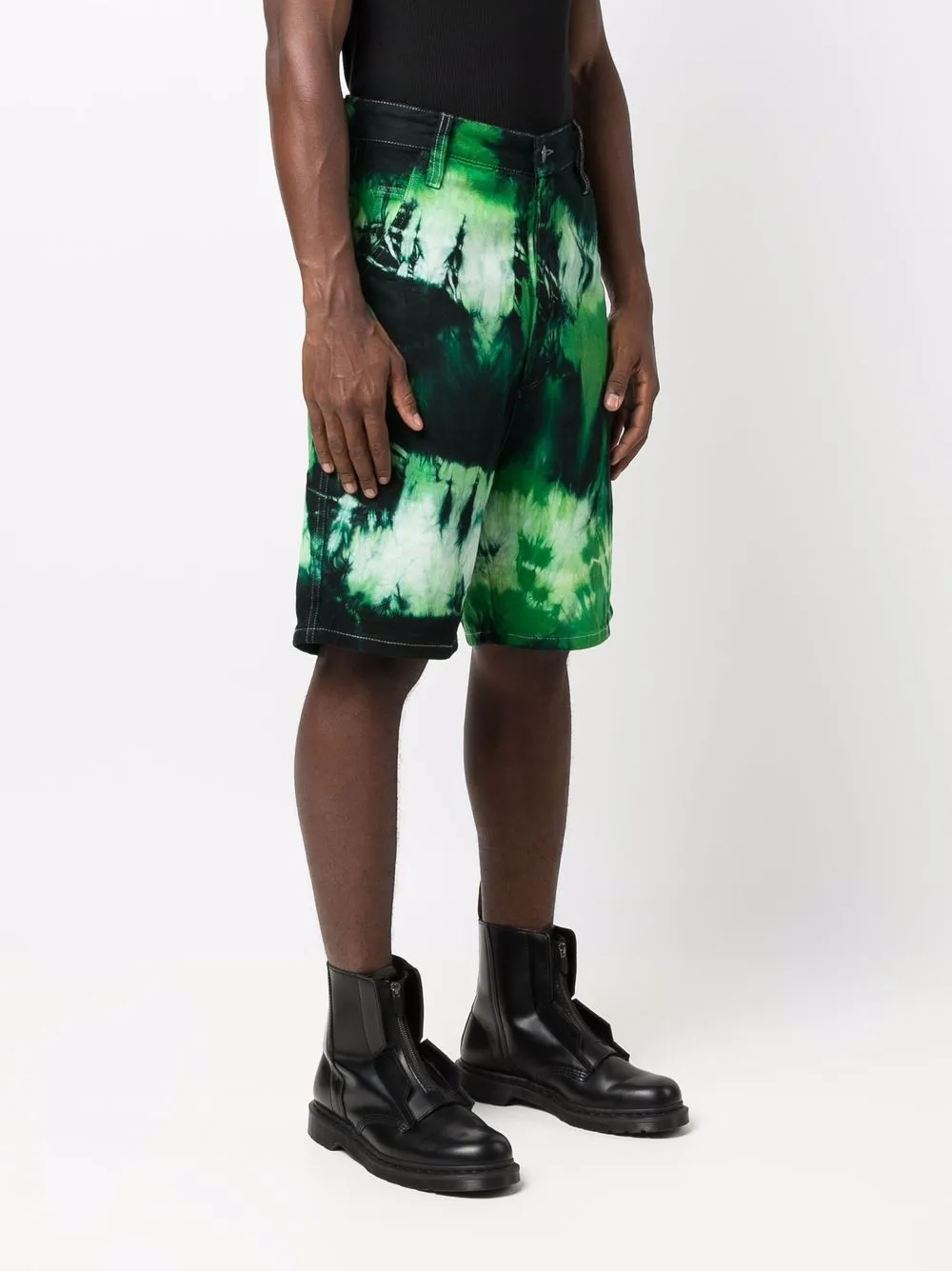 Принт тай-дай, нашивка с логотипом сзади, завышенная талия, свободный крой, петли для ремня, застежка на молнии и пуговице спереди, классическая пятикарманная модель и длина по колено. Цвет: зеленый. Это унисекс-модель. Обратите внимание, что для нее используется мужская размерная сетка.