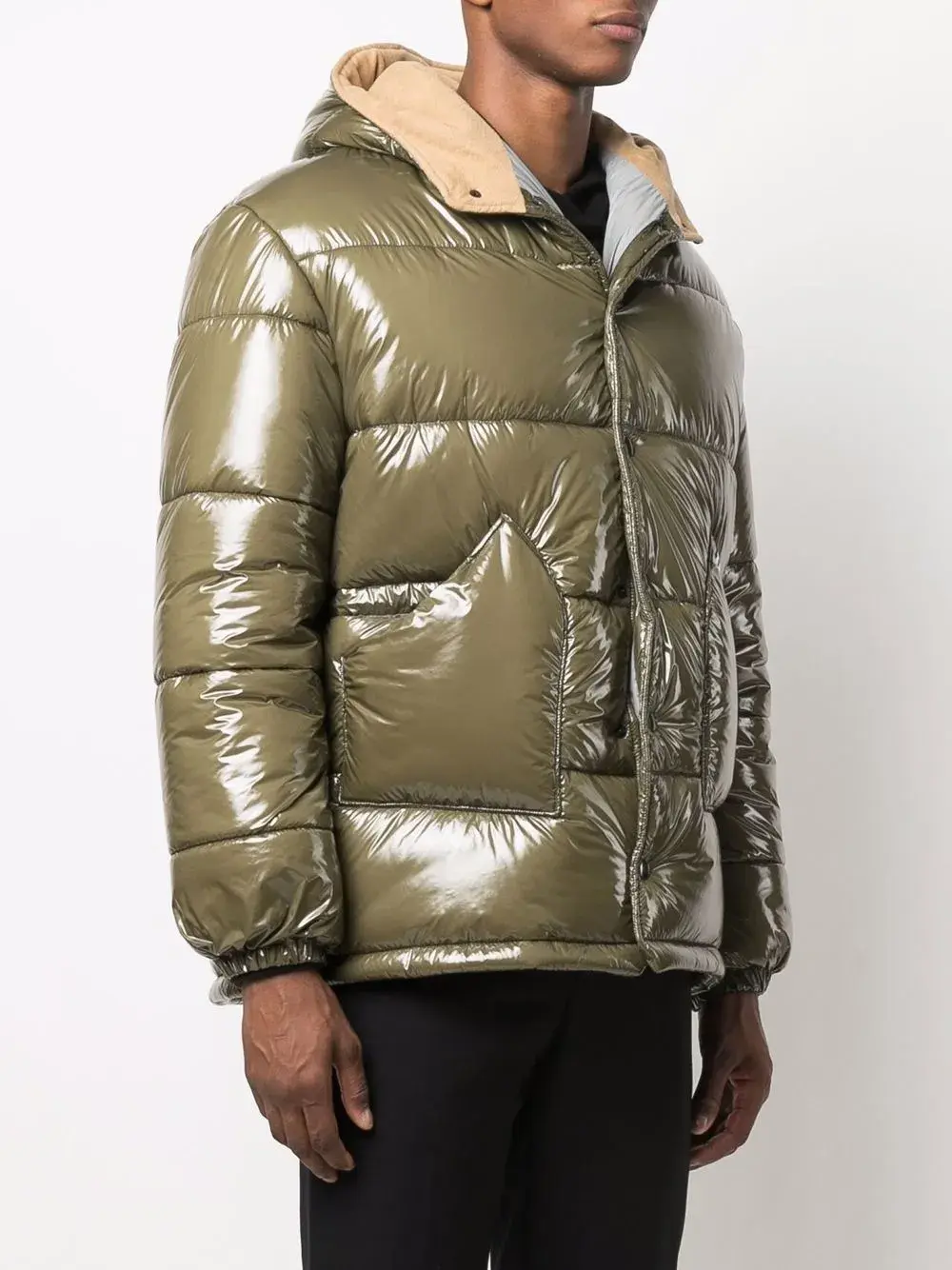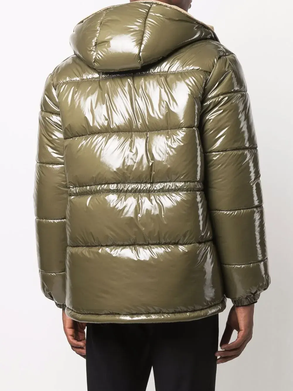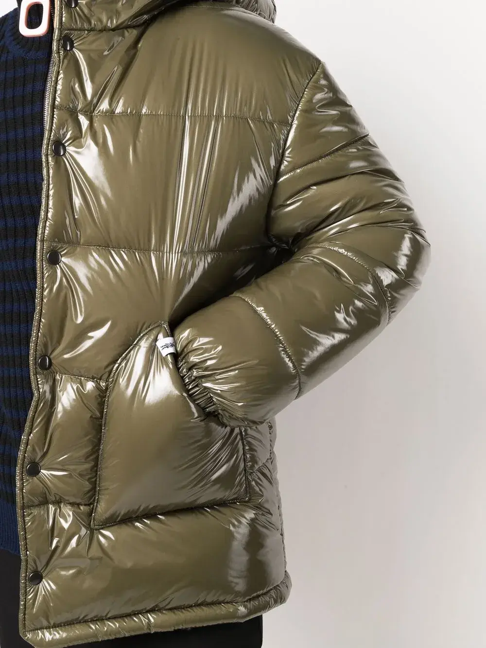 Дутый материал, воротник-труба, два передних кармана, застежка на кнопках спереди и длинные рукава.