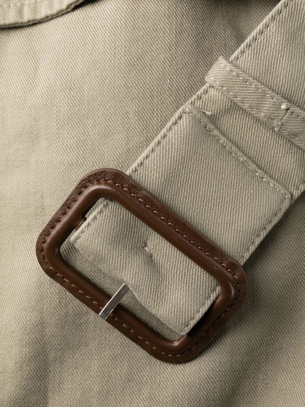 Нашивка с логотипом, деконструированная модель, длинные рукава, отложный воротник, два передних кармана с клапанами, нагрудный накладной карман, ремень на талии и двубортная застежка на кнопки.