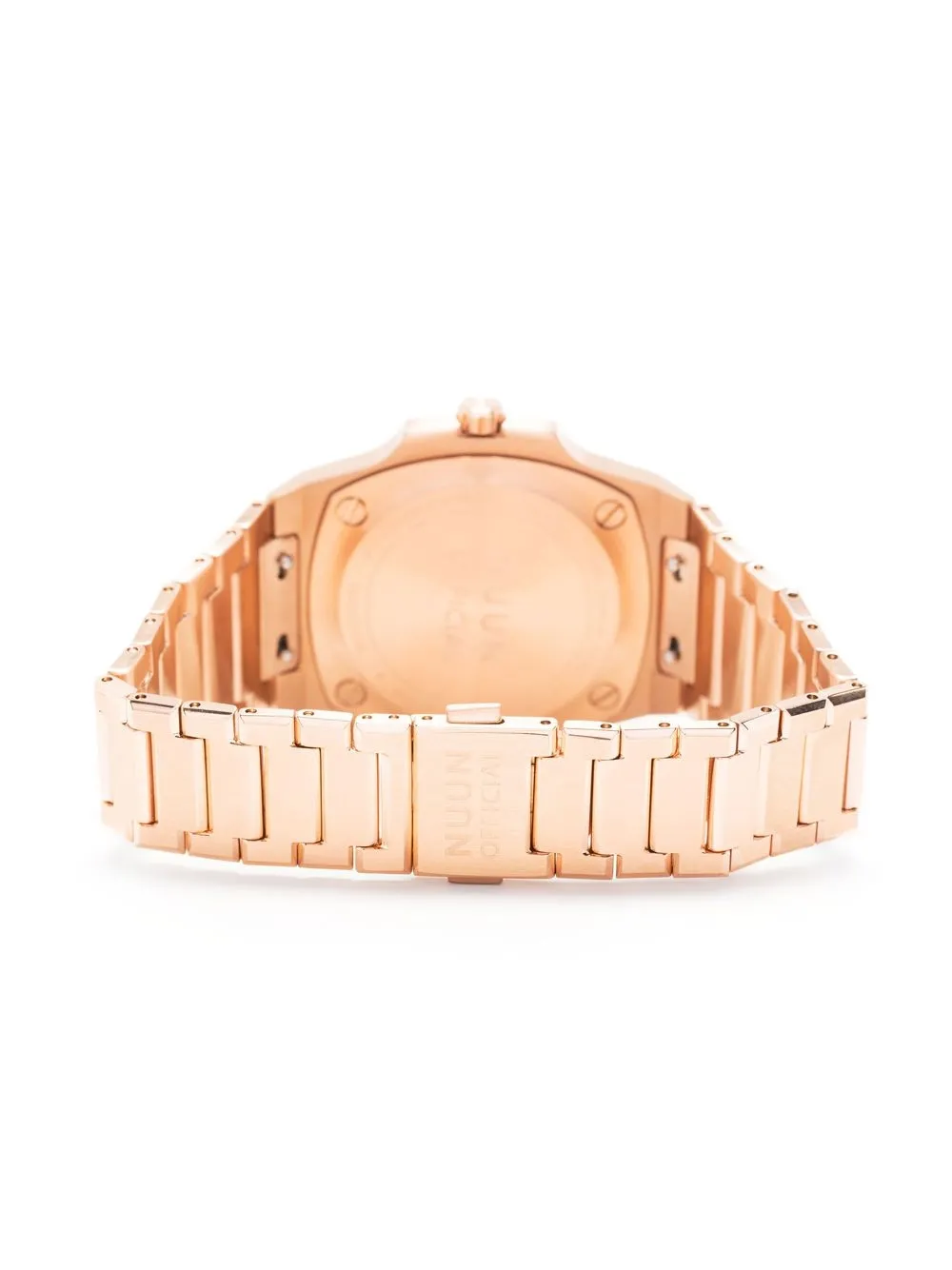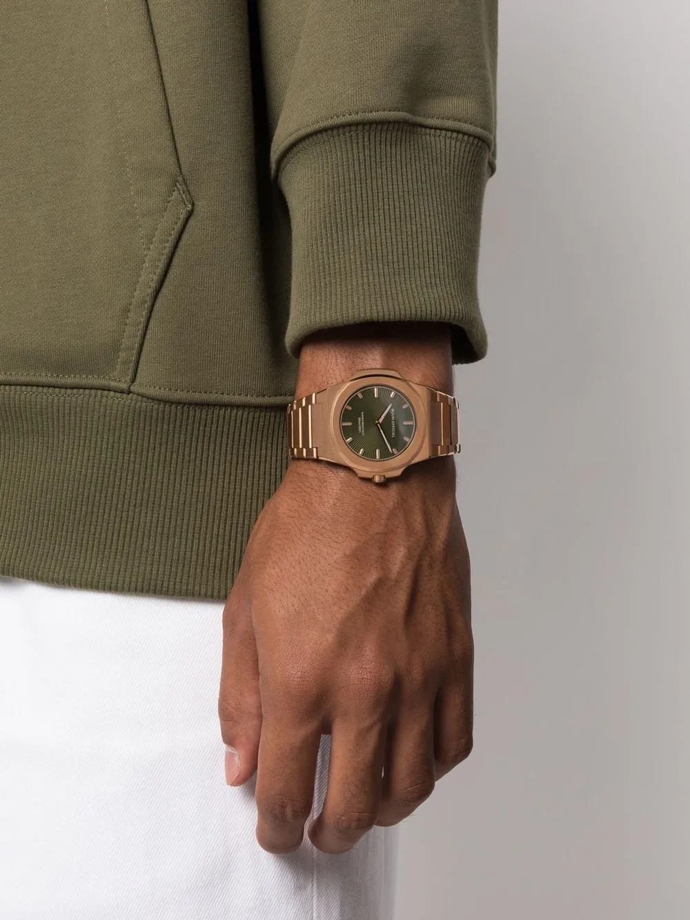 Зеленый, фурнитура цвета розового золота, нержавеющая сталь, кварцевый механизм, круглый корпус, прямоугольные вытянутые индексы, прямоугольные вытянутые стрелки, круглый корпус, завинчивающаяся заводная коронка, регулируемый браслет со звеньями и потайная застежка.