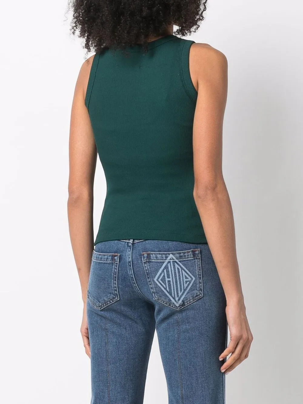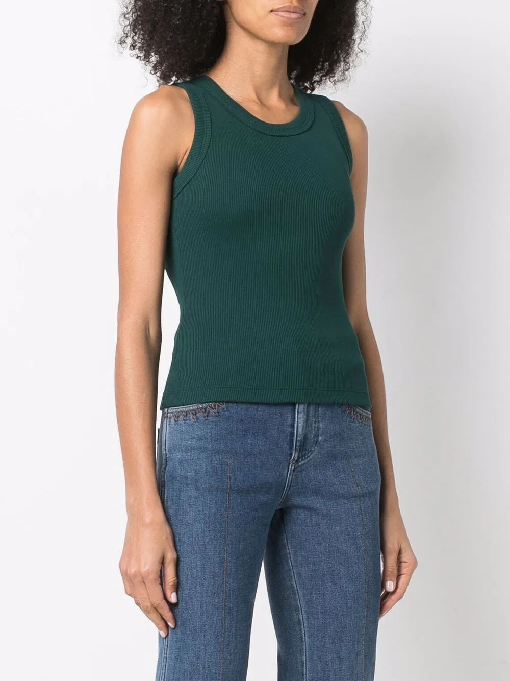 Ткань в мелкий рубчик, круглый вырез, без рукавов, прямой подол и узкий крой. Цвет: зеленый. .