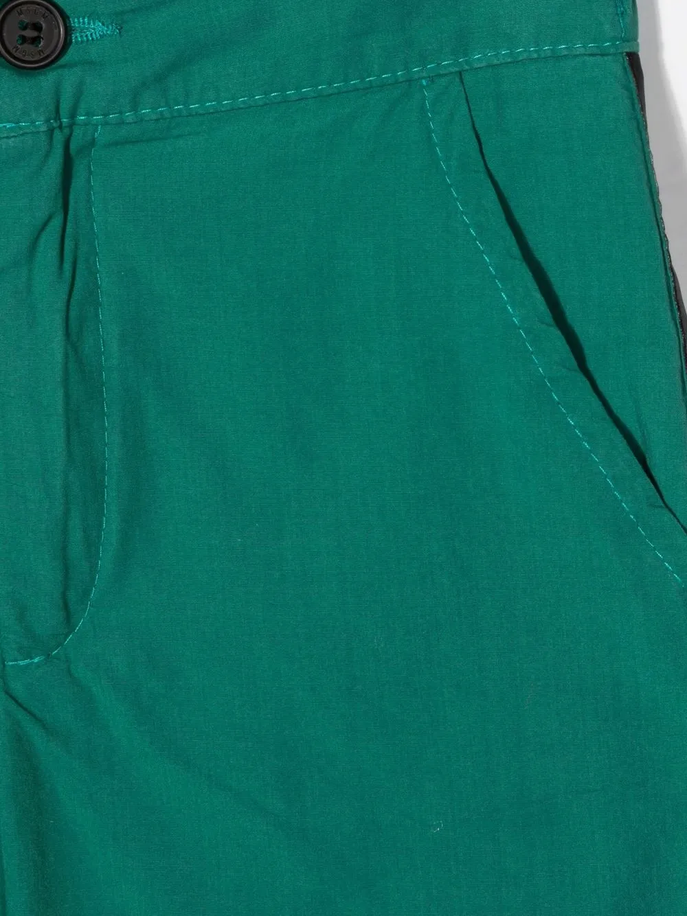 Отделка лентой с логотипом, нашивка с логотипом сзади, эластичный пояс, застежка на молнии и пуговице спереди, два кармана по бокам и задние карманы с листочкой. Цвет: зеленый.