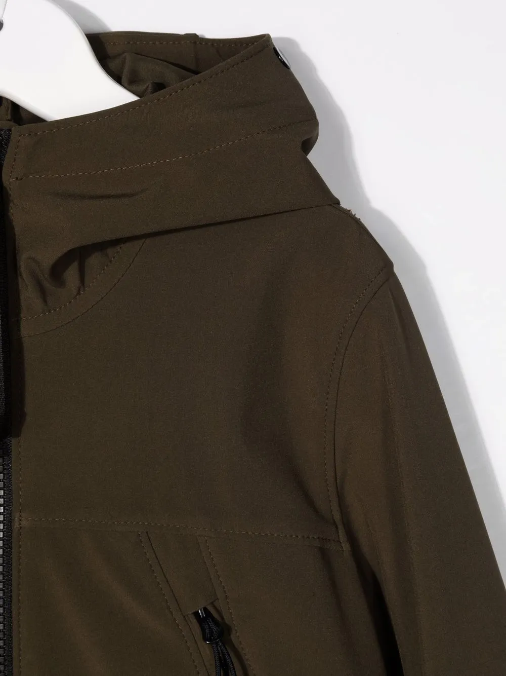 Декоративная линза, классический капюшон, застежка на молнии спереди, передние карманы на молнии и длинные рукава.
