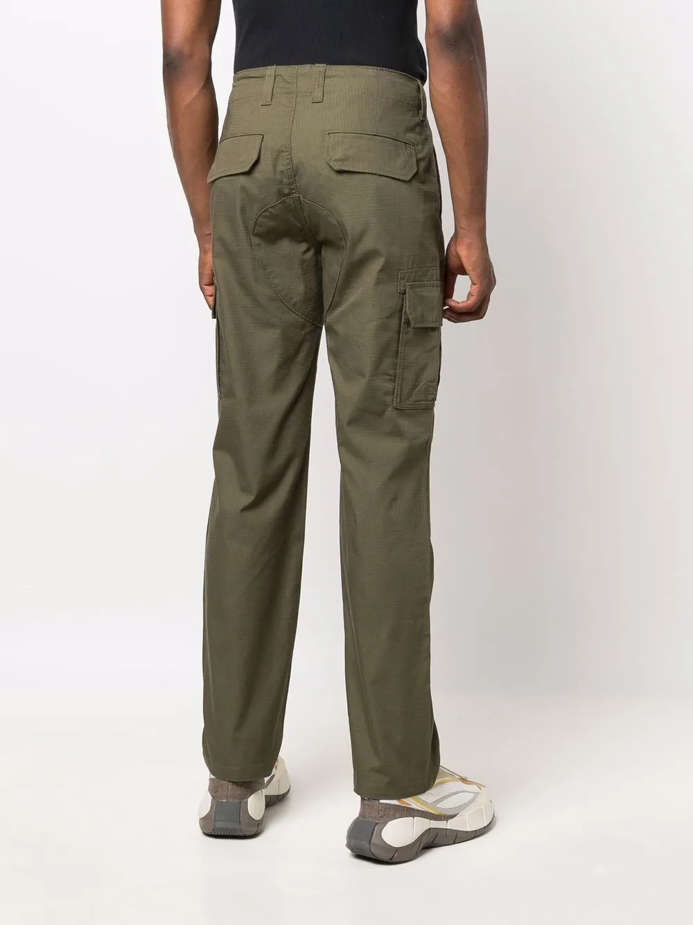 Петли для ремня, застежка на молнии и пуговице спереди, прямой крой, два прорезных кармана по бокам, два накладных кармана по бокам и два кармана с клапанами сзади.