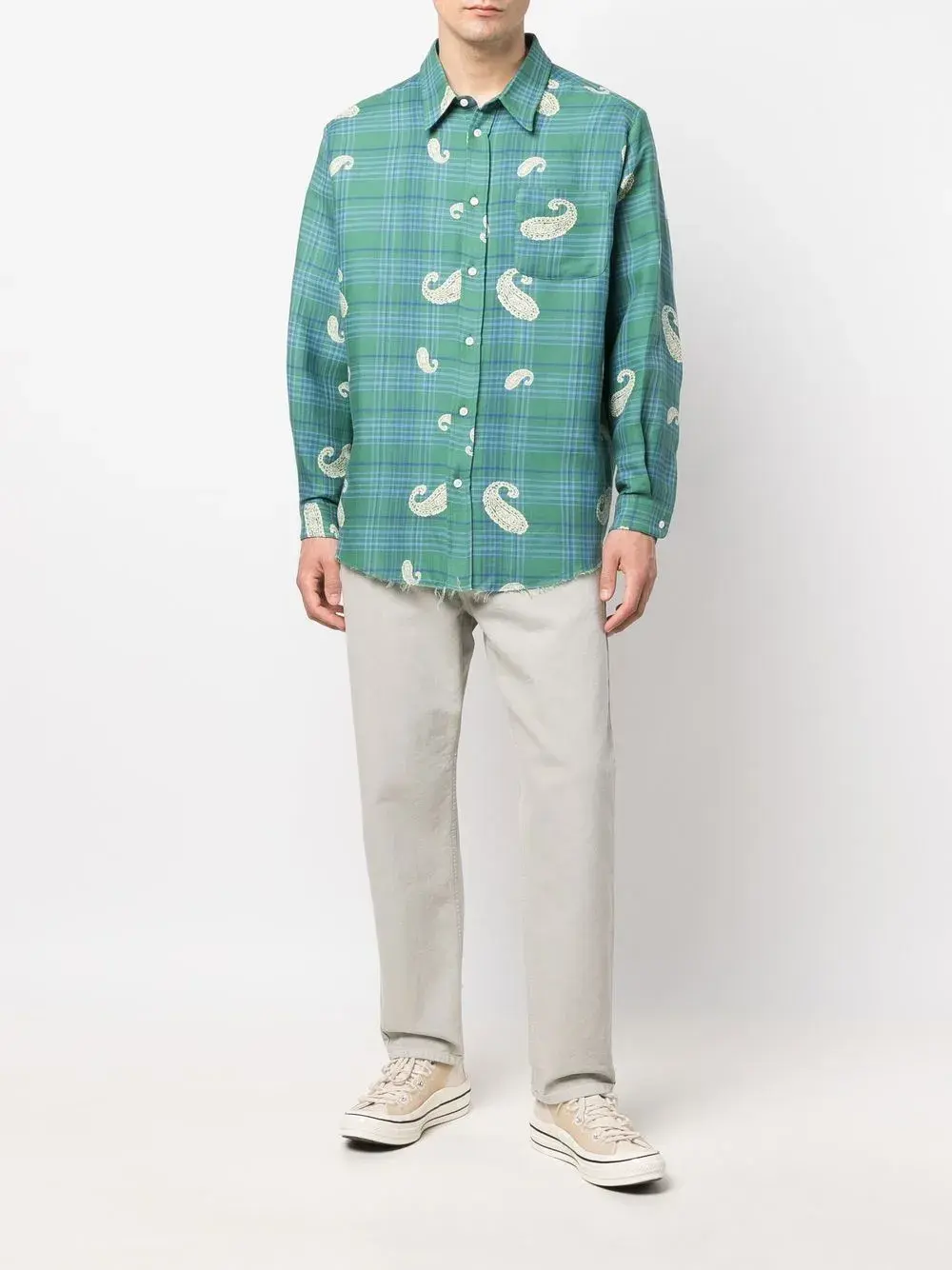 Принт в клетку, абстрактный принт, классический воротник, застежка на пуговицах спереди, длинные рукава и необработанные края.