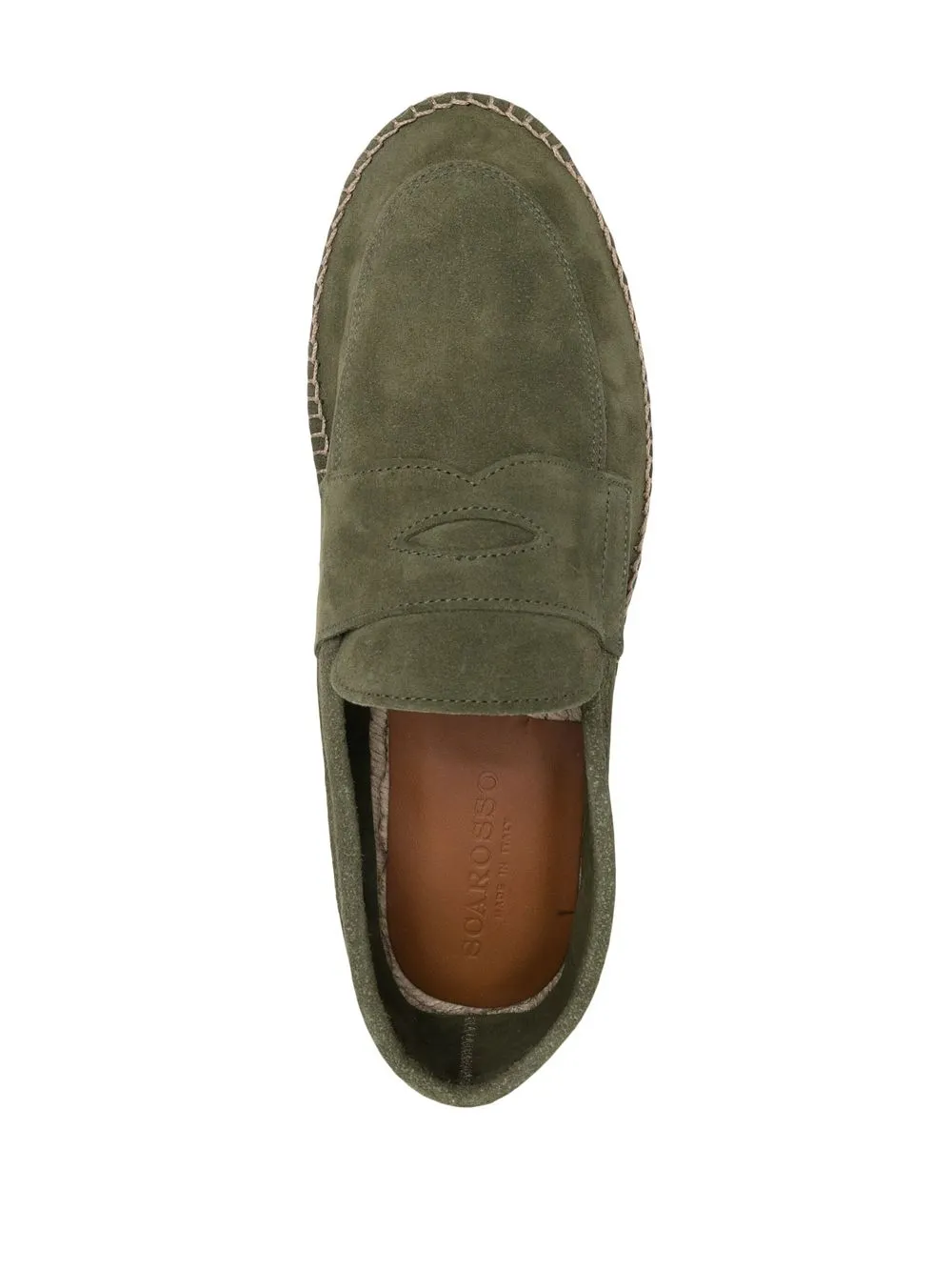 Зеленый, замша, кожа, рафия, прорези на язычке, миндалевидный носок, строчка в тон, стелька с логотипом, модель без застежки и резиновая подошва.