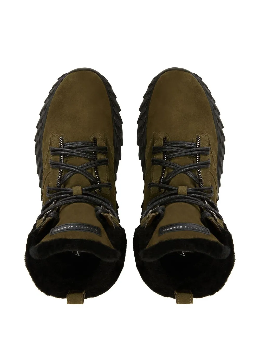 Оливковый, замша, подкладка из овечьей шерсти, закругленный носок, шнуровка спереди, отделка с декоративной молнией, высота по щиколотку, петля для подтягивания сзади и стелька с логотипом.