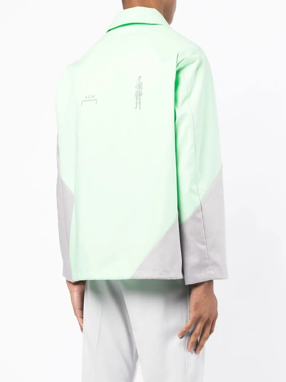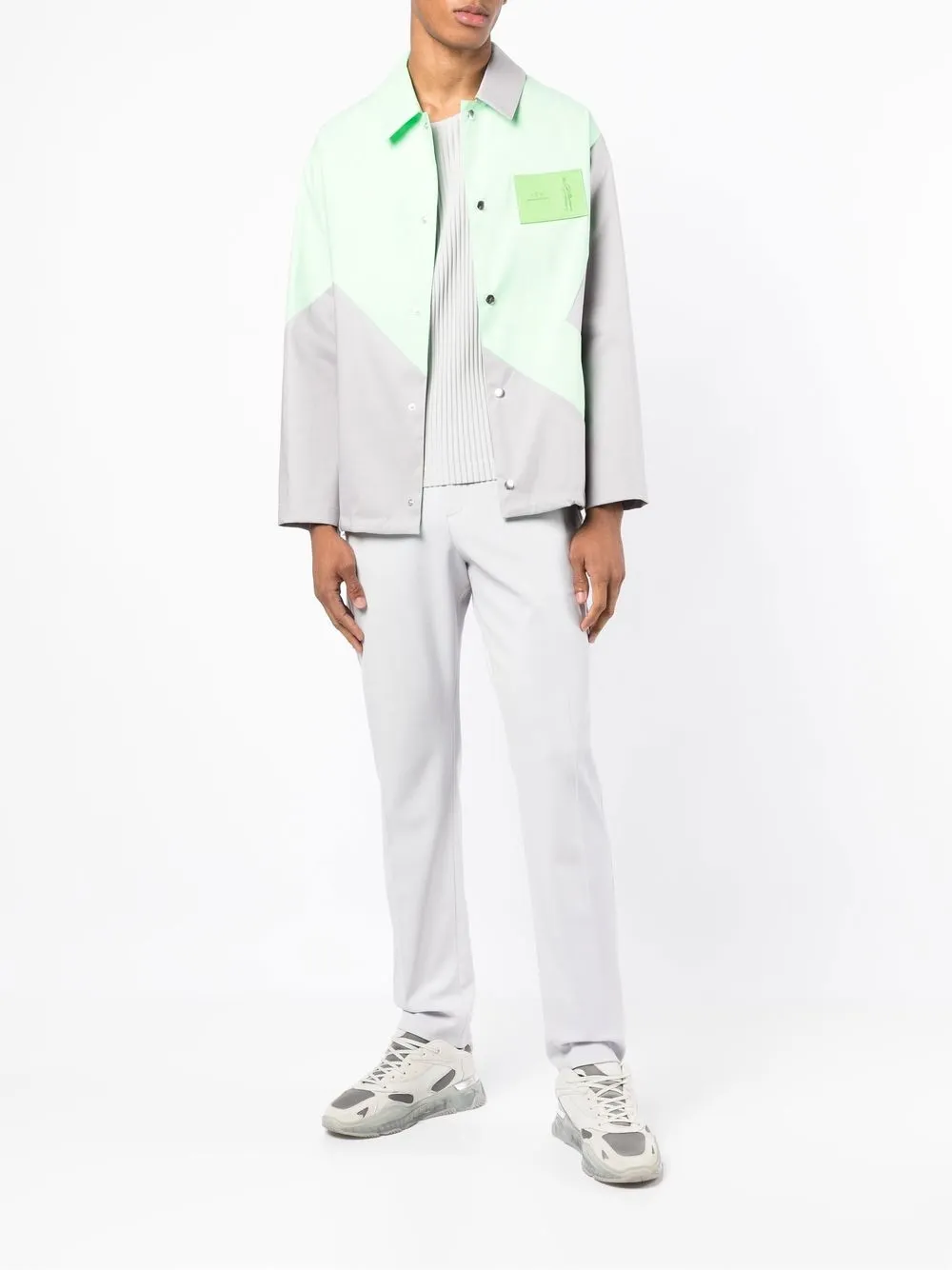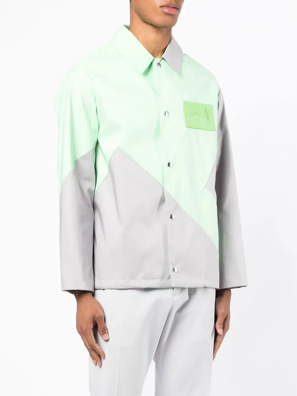Серый, зеленый, хлопок, геометричные вставки, нашивка с логотипом на груди, застежка на кнопках спереди, классический воротник, длинные рукава и прямой подол.