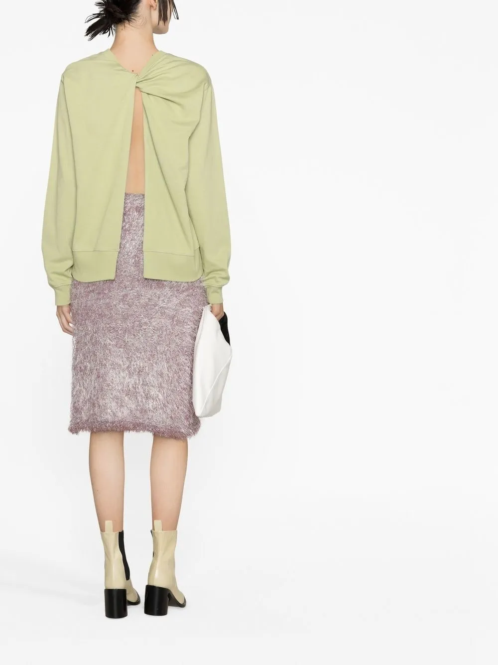 Зеленый, хлопок, круглый вырез, перекрученная деталь, открытая спина, длинные рукава и прямой подол.