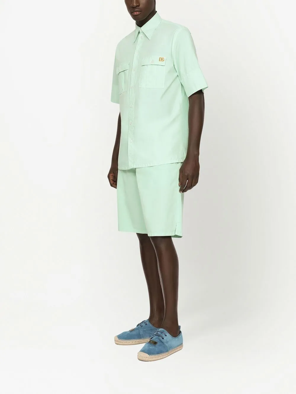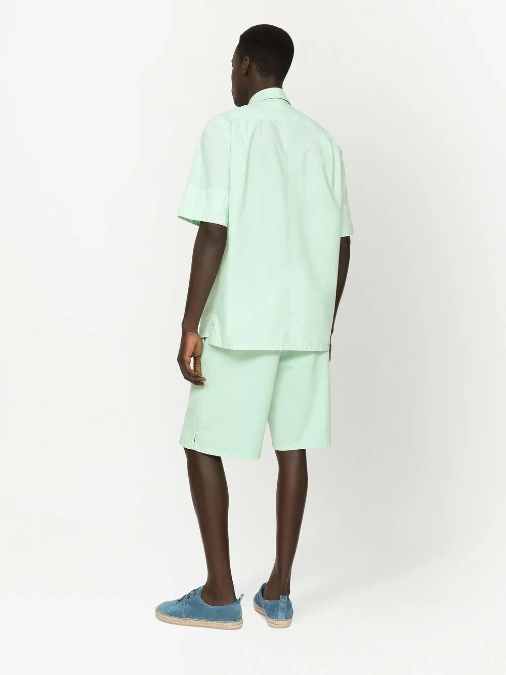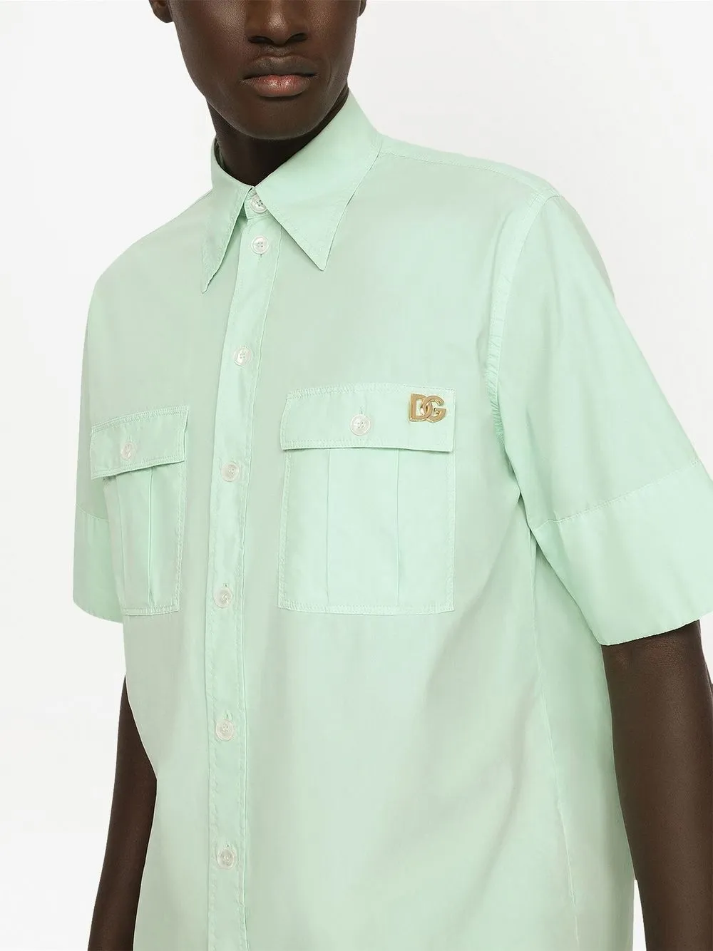 Мятно-зеленый, хлопок, золотистый металлический логотип, плоский заостренный воротник, застежка на пуговицах спереди, два нагрудных кармана с клапанами, короткие рукава и прямой подол.
