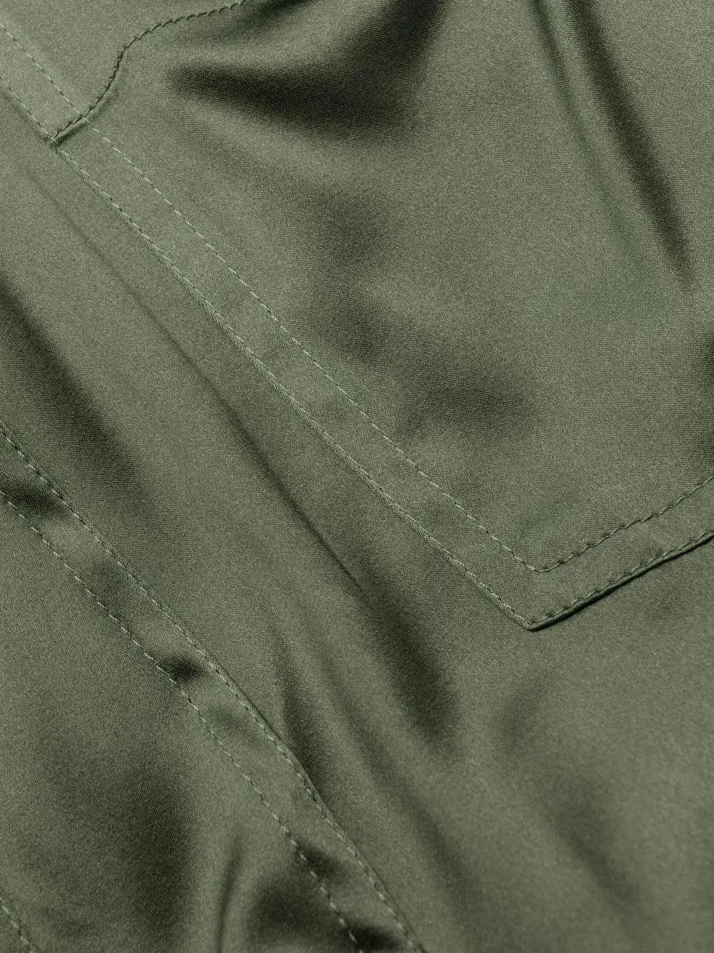 Оливковый, черный, эластичный шелк, пояс с логотипом, эластичный материал, прямой крой и два накладных кармана сзади.