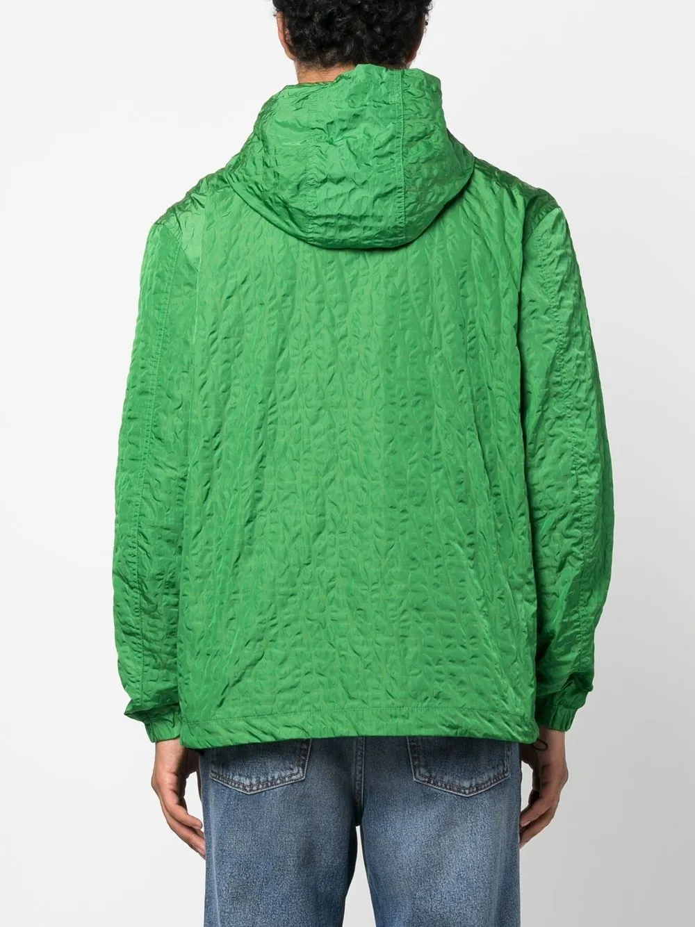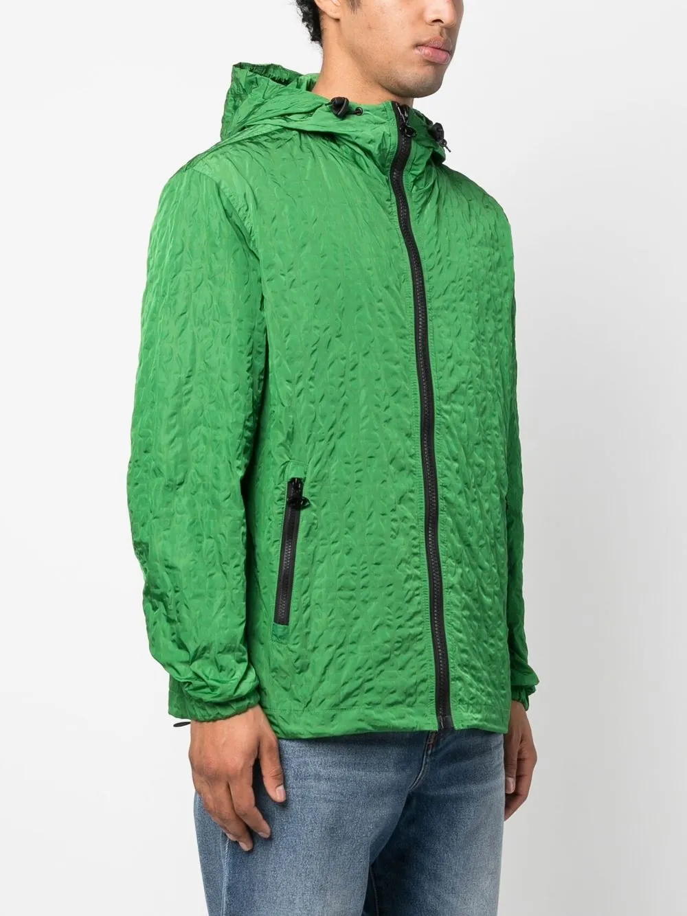 Ярко-зеленый, фактурная отделка, затягивающийся на шнурок капюшон, застежка на молнии спереди, передние карманы на молнии, длинные рукава, эластичные манжеты и прямой подол.