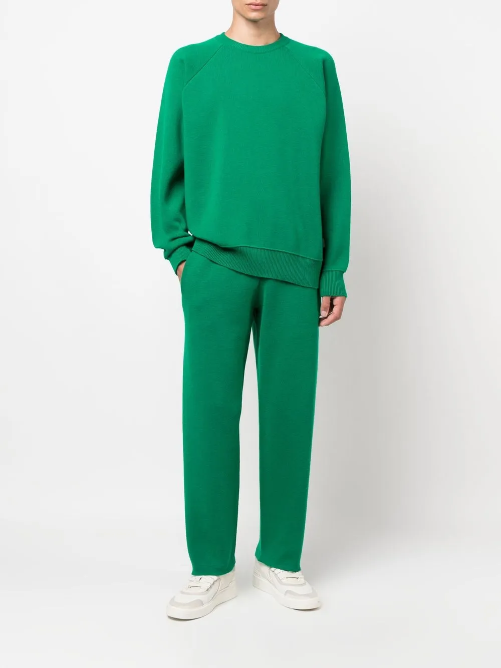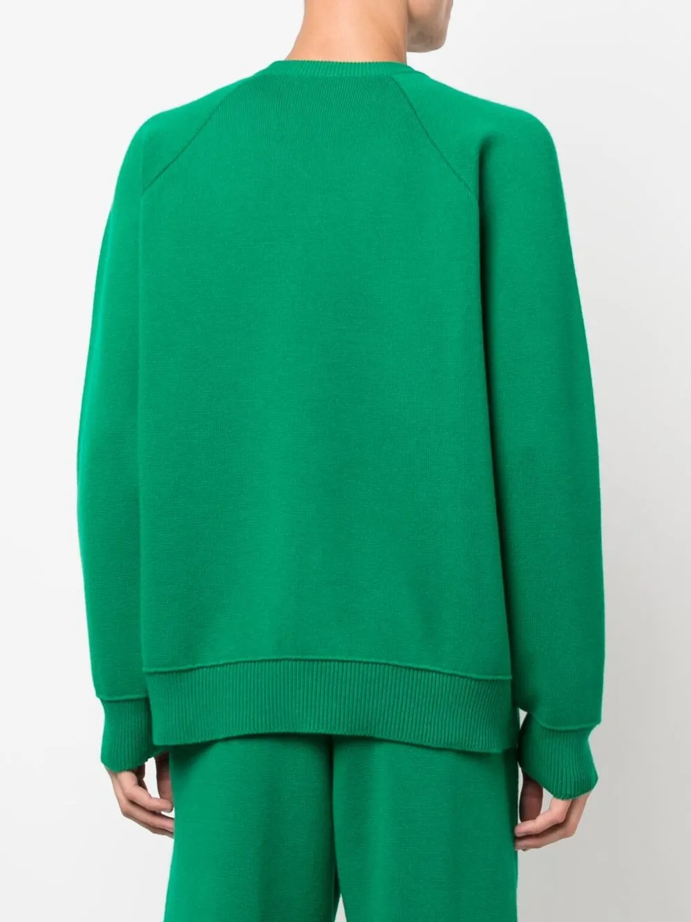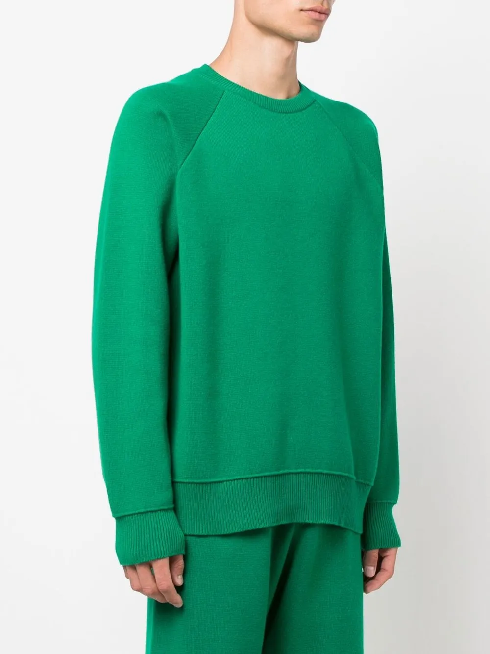 Ярко-зеленый, трикотажный материал, отделка в рубчик, круглый вырез, длинные рукава и прямой подол.