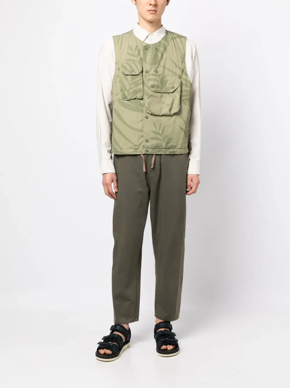 Хаки, хлопок, принт с изображением листьев, два передних кармана с клапанами, круглый вырез, застежка на кнопках спереди, без рукавов и подол с кулиской.