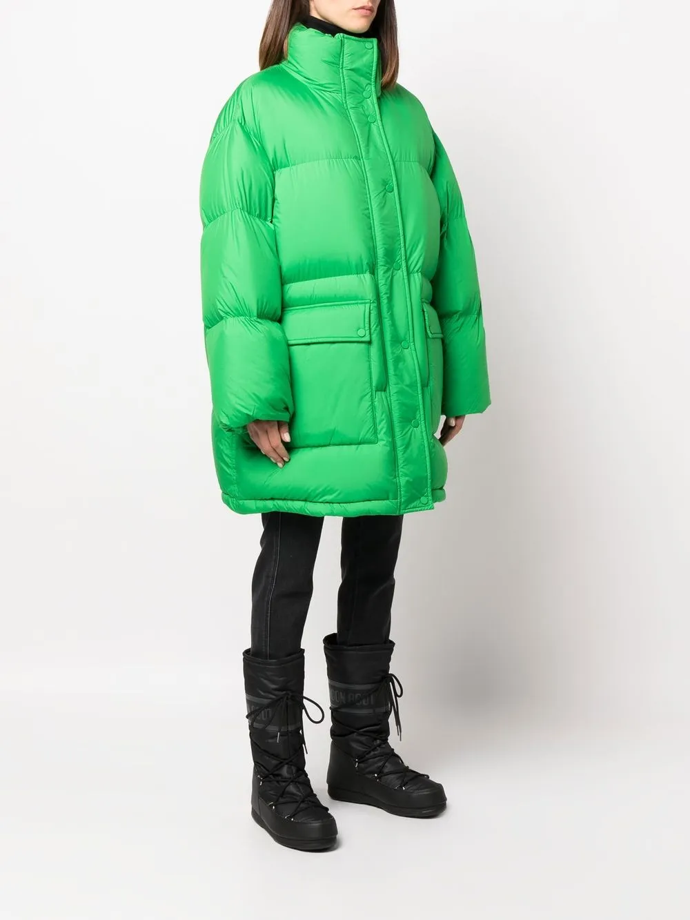 Ярко-зеленый, дутый материал, высокий воротник, застежка на кнопках спереди, длинные рукава, два передних кармана и длина миди.