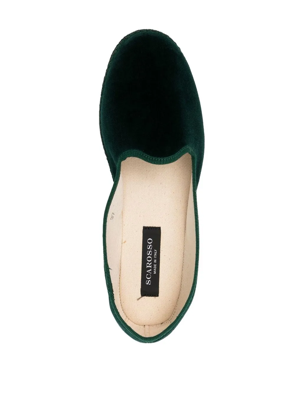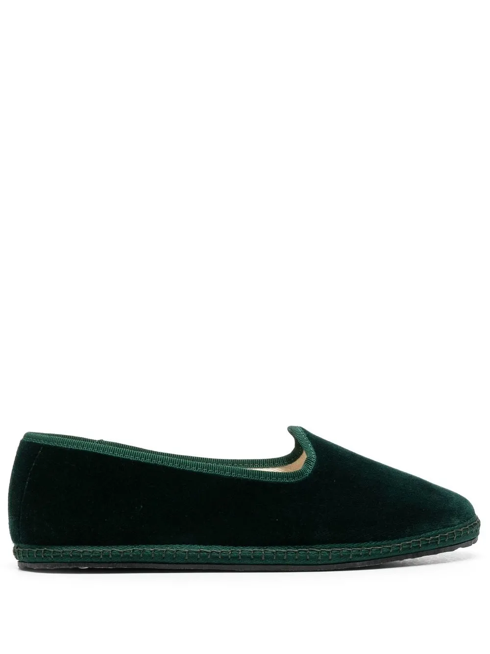 Насыщенный зеленый, бархат, объемная окантовка, модель без застежки и плоская резиновая подошва.