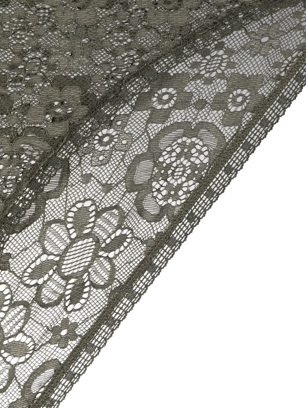 Оливково-зеленый, вставки из цветочного кружева, полупрозрачный дизайн, низкая посадка и модель без застежки. Эту вещь можно примерить, но только поверх собственного белья.