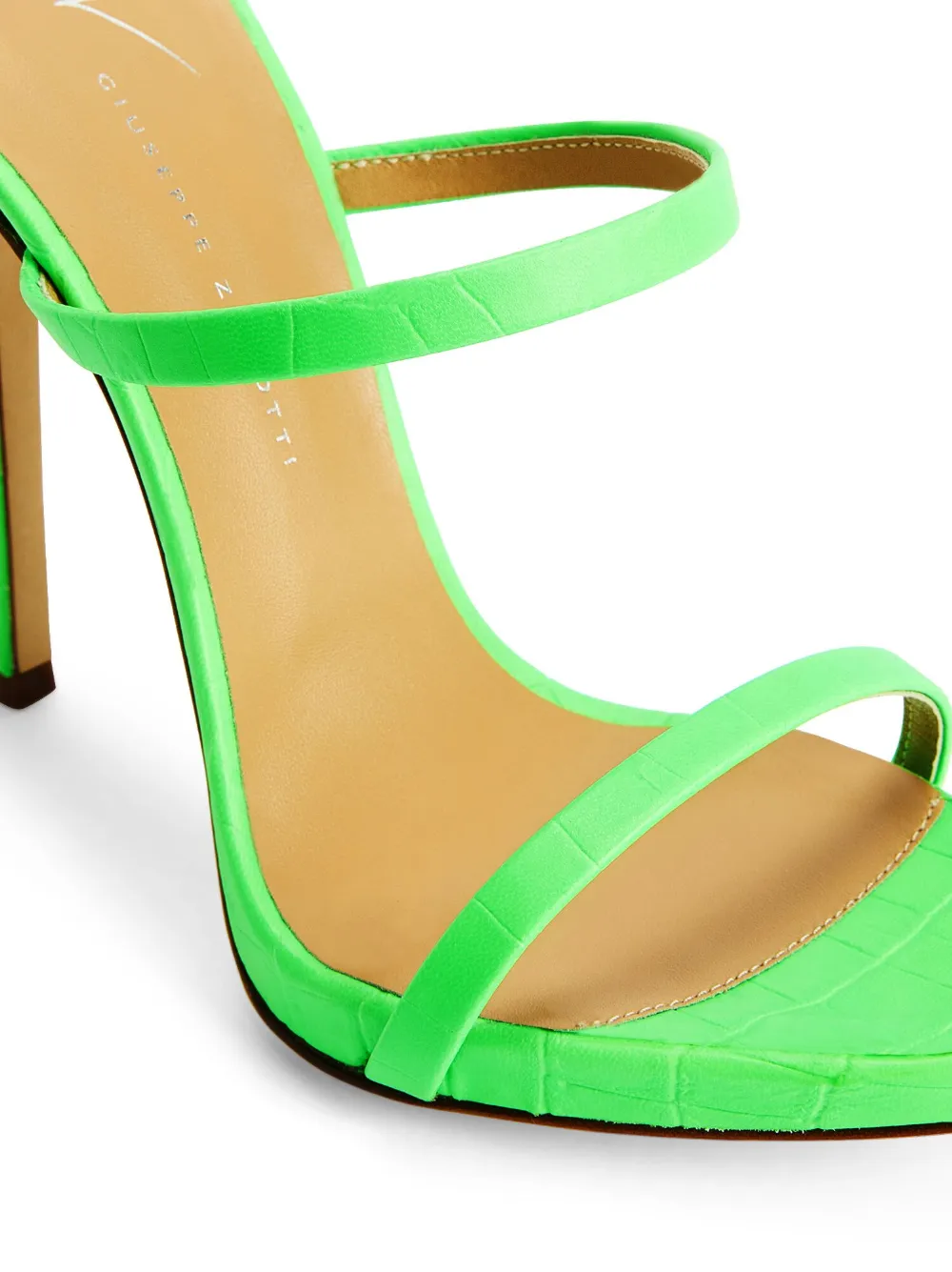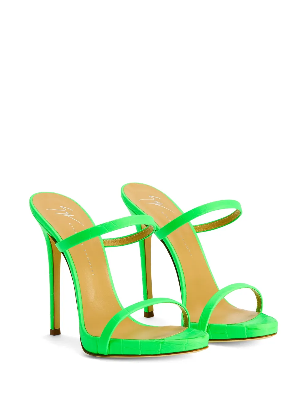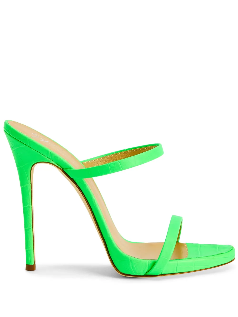 Флуоресцентный зеленый, телячья кожа, тиснение под кожу крокодила, браслет в два оборота, стелька с логотипом, открытый носок, миндалевидный носок, модель без застежки и каблук на высокой шпильке.