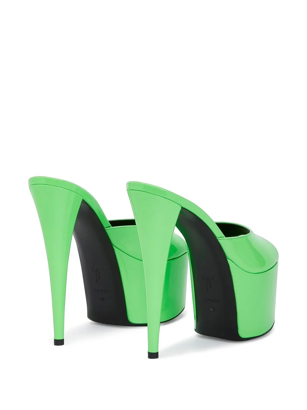 Цвет зеленого яблока, кожа, лакированная отделка, открытый носок, модель без застежки, кожаная стелька с логотипом, подошва на платформе и высокий каблук.