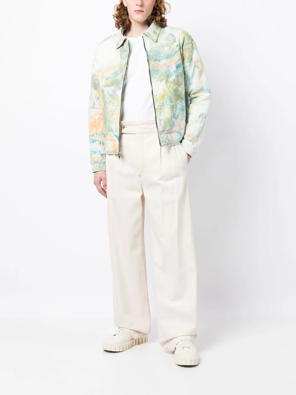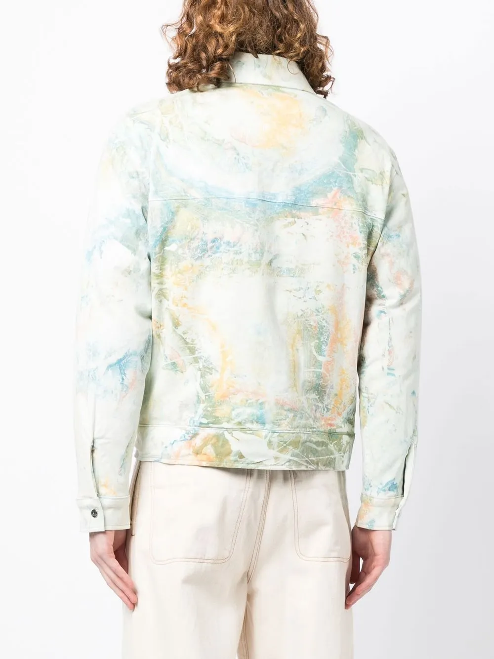 Светло-зеленый, разноцветный, мраморный узор, вышитый логотип, классический воротник, застежка на молнии спереди, длинные рукава и прямой подол.