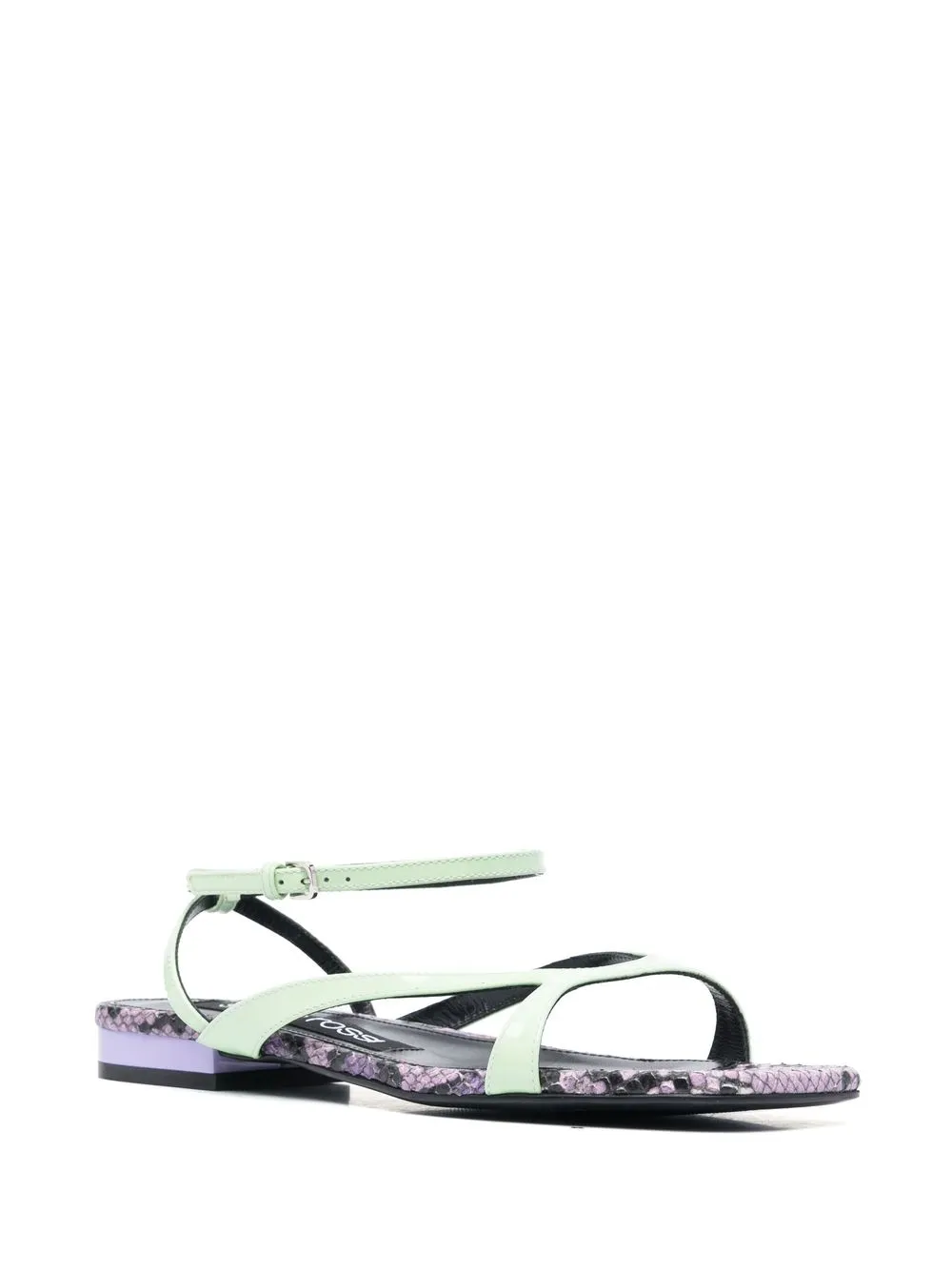 Мятно-зеленый, фиолетовый, телячья кожа, змеиный принт, открытый носок, ремешок на щиколотке с пряжкой, логотип на стельке и кожаная подошва.
