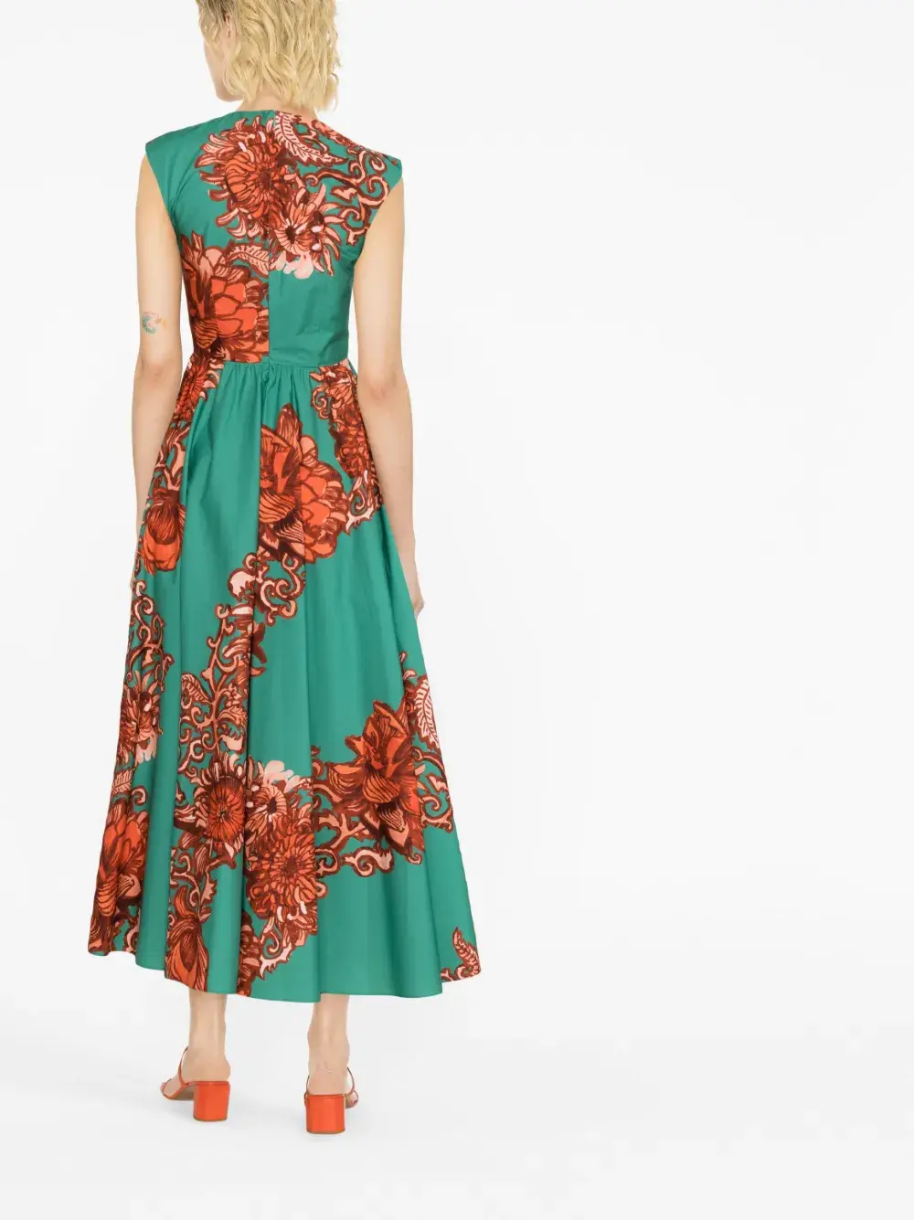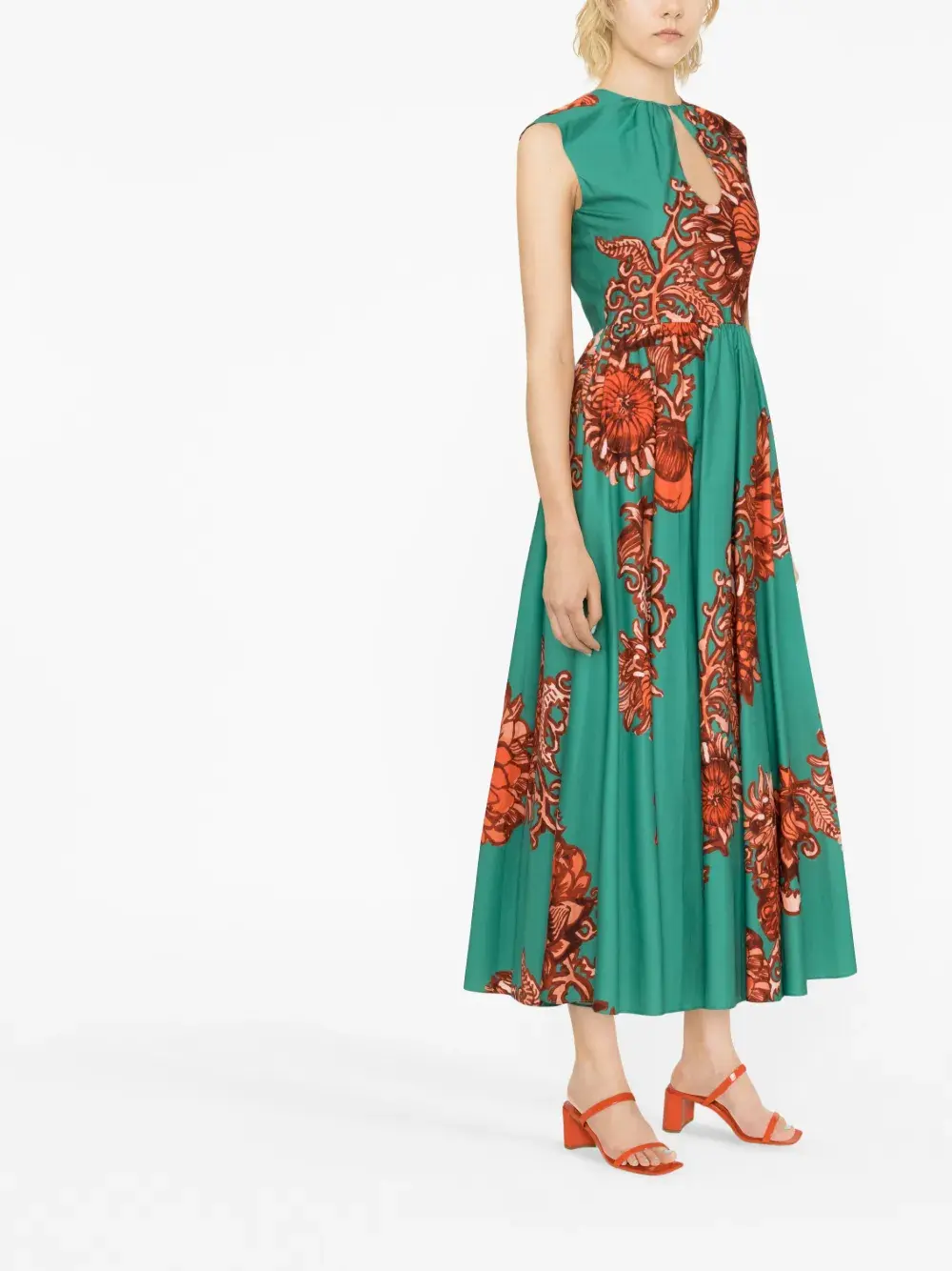 Насыщенный зеленый, хлопок, сплошной цветочный принт, круглый вырез, без рукавов, вырезные детали, приталенный силуэт, расклешенная юбка и высота по щиколотку.