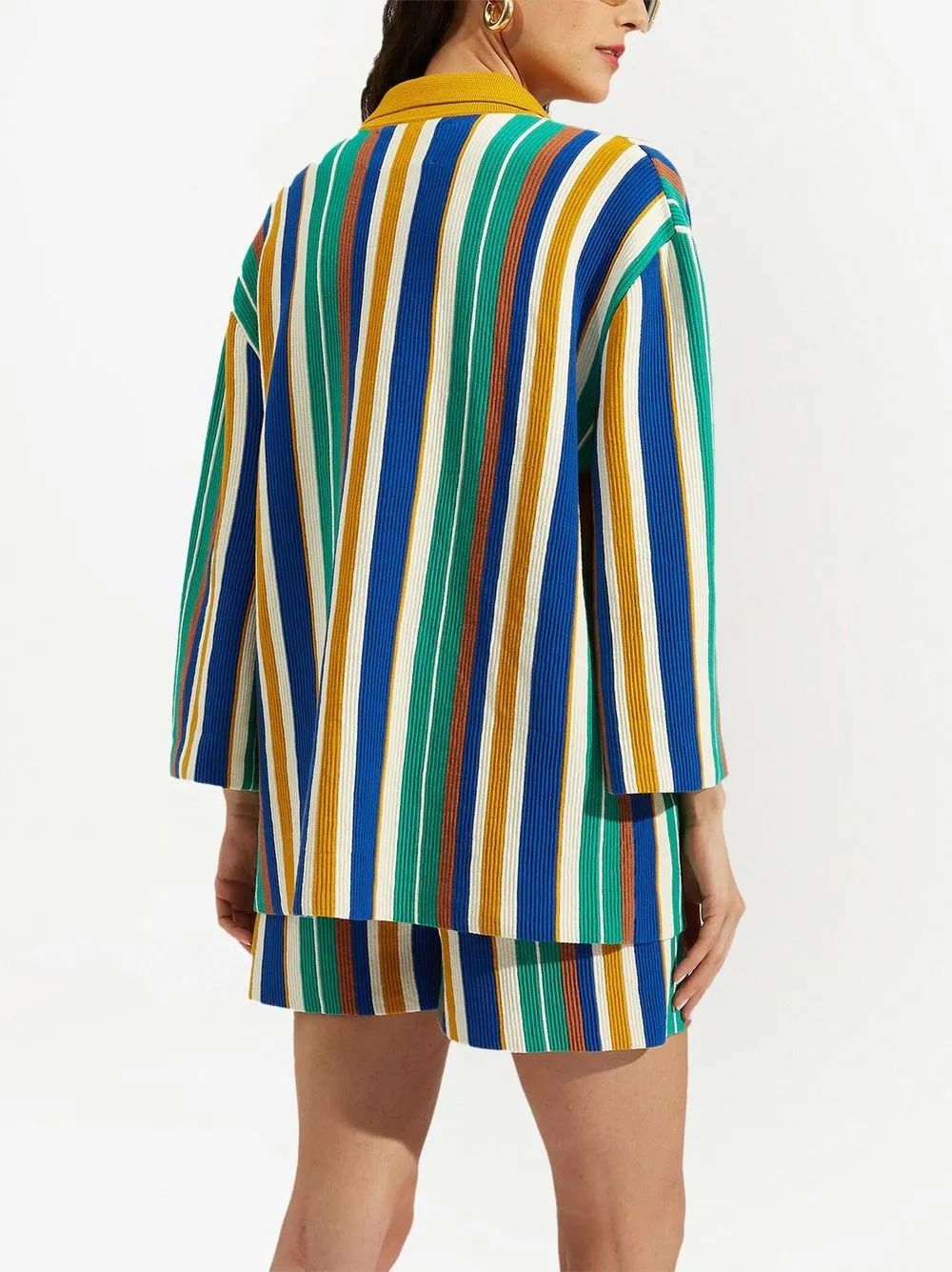 Зеленый, разноцветный, хлопок, узор в вертикальную полоску, V-образный вырез, рукава три четверти и прямой подол.