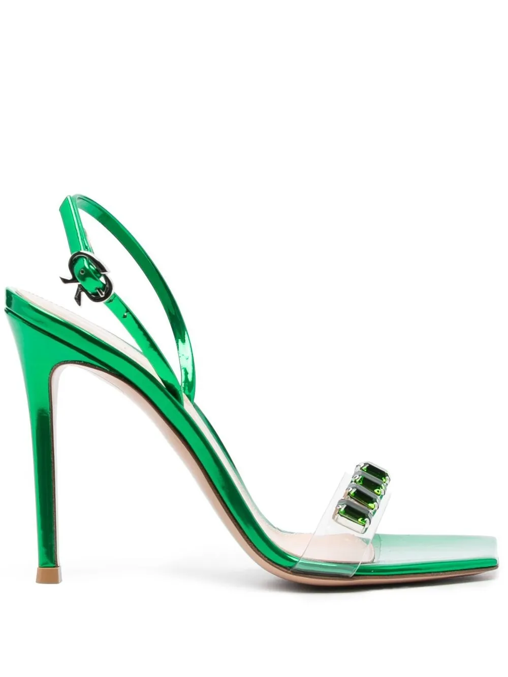 Расцветка Grass Green, телячья кожа, покрытие с эффектом металлик, прозрачный ремешок, украшение из поделочных камней, ремешок на пятке с пряжкой и каблук на высокой шпильке.