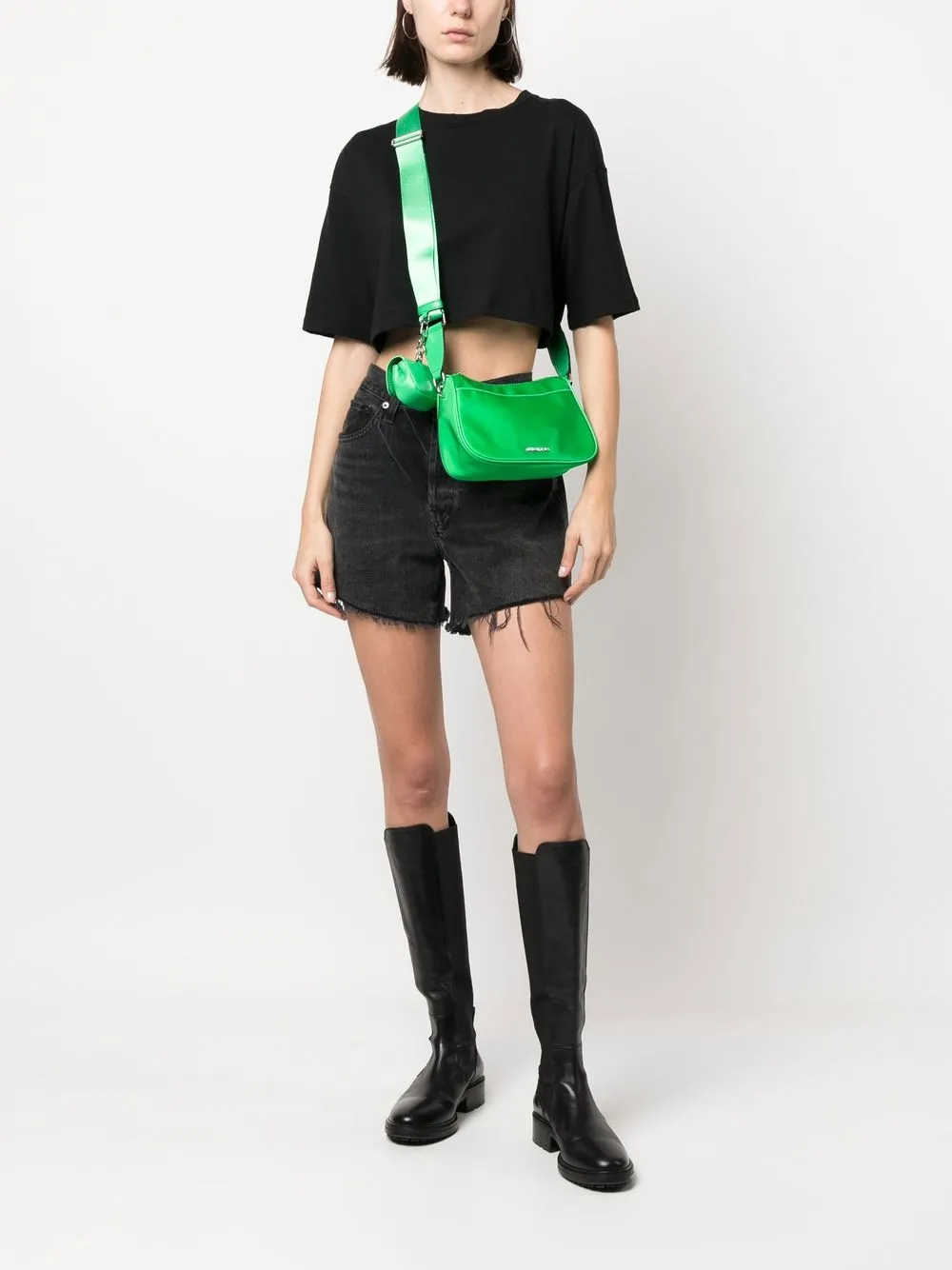 Зеленый, телячья кожа, серебристый логотип, застежка на молнии сверху, основное отделение, регулируемый ремень на плечо и съемный кошелек для монет.