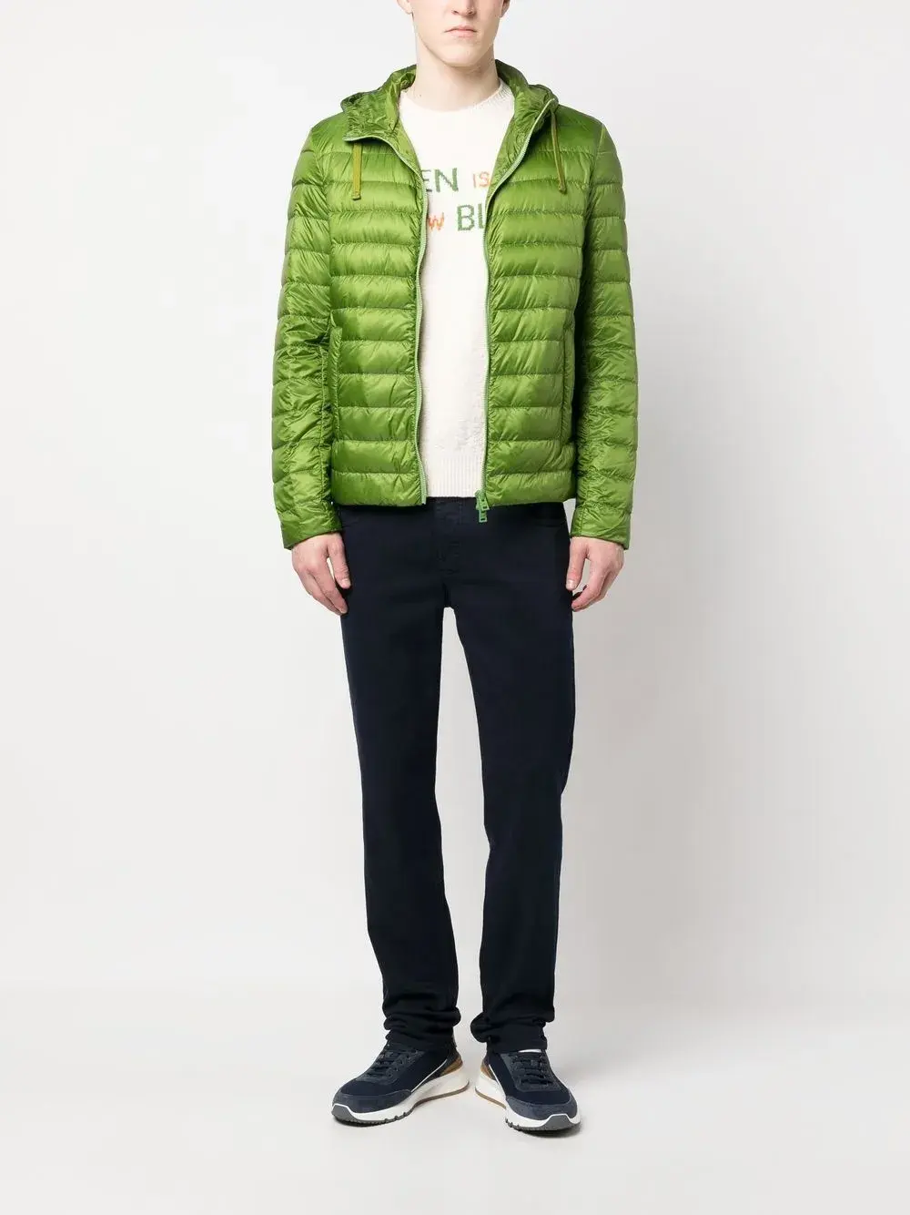 Расцветка Grass Green, наполнитель из смеси пуха и пера, дутый материал, затягивающийся на шнурок капюшон, двусторонняя молния спереди, два прорезных кармана сбоку, длинные рукава и прямой подол.
