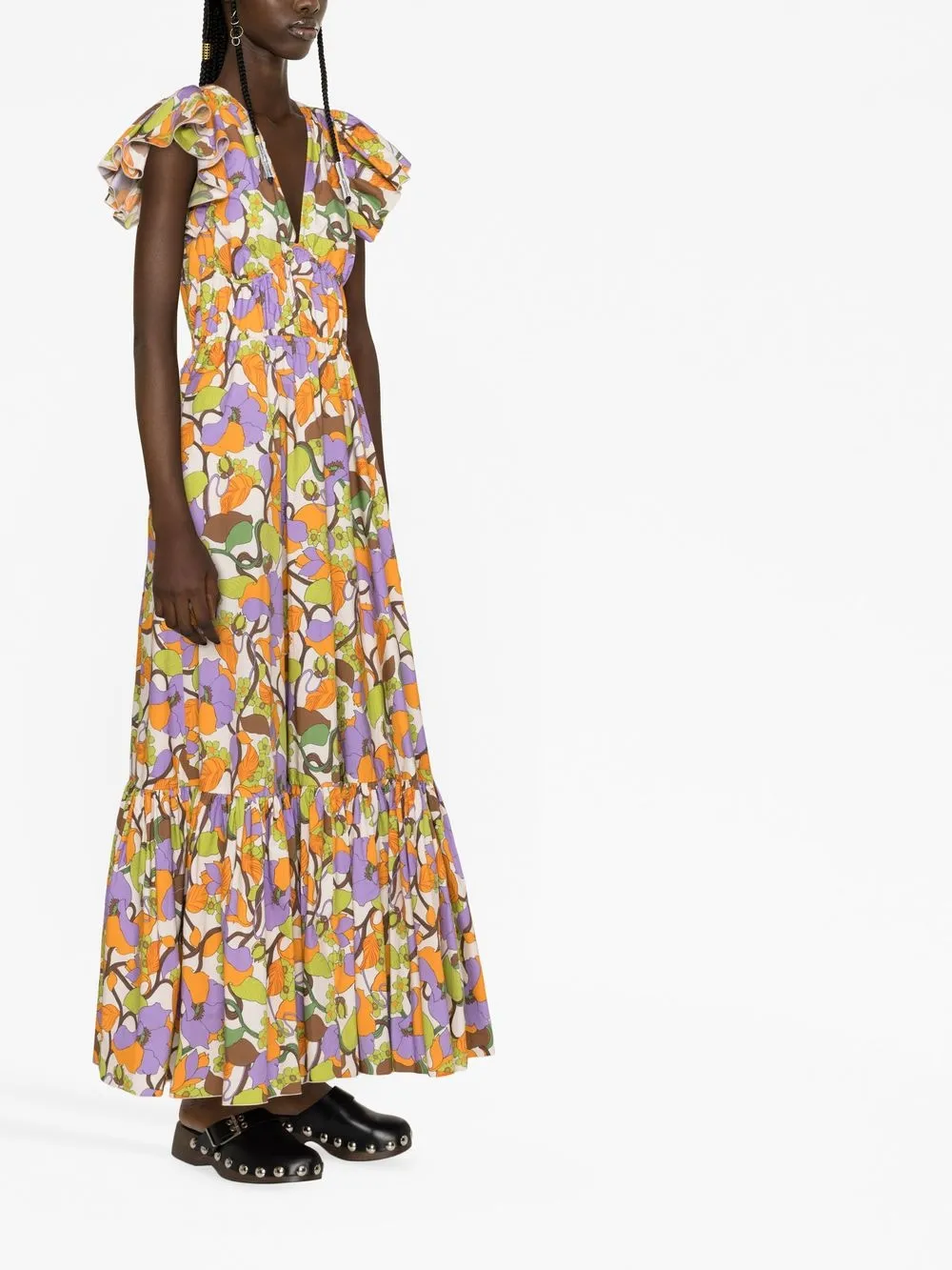 Разноцветный, хлопок, шелковая вуаль, сплошной цветочный принт, V-образный вырез, расклешенные рукава, детали с оборками, ярусная юбка, прямой подол и высота по щиколотку.