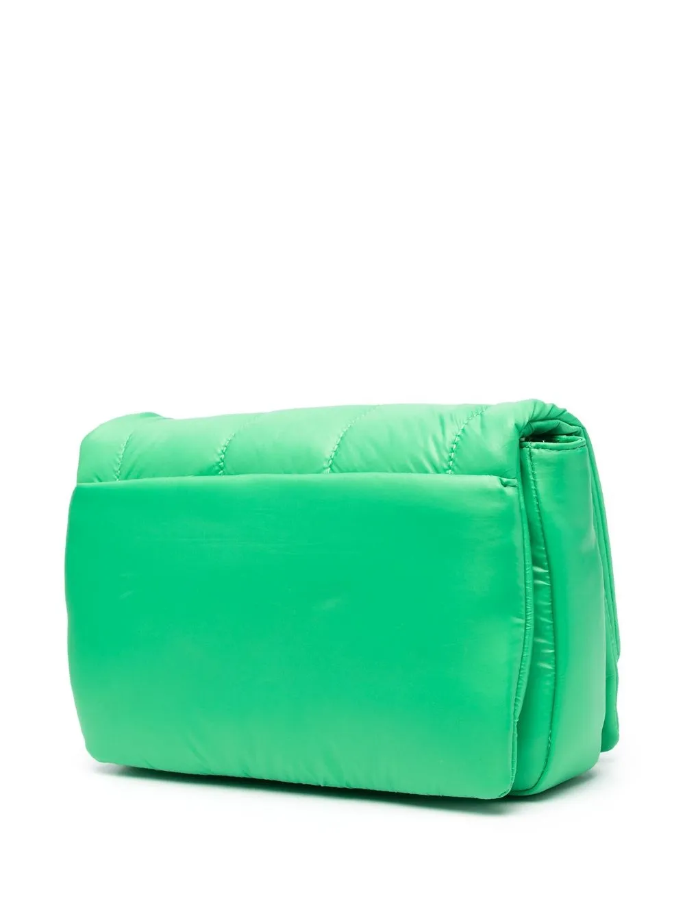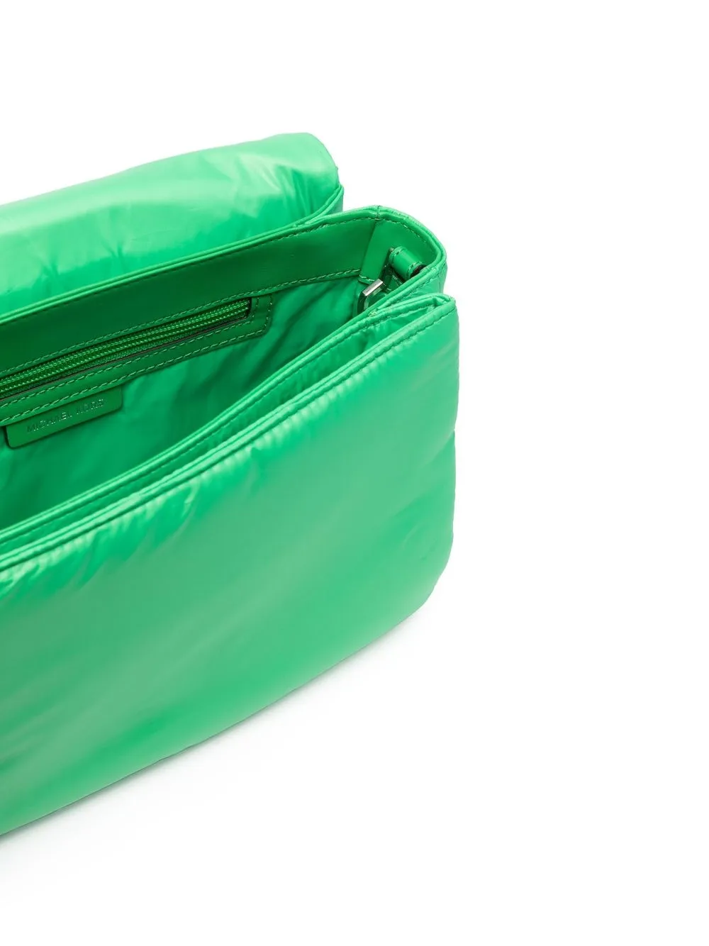 Зеленый, дутый материал, серебристый металлический логотип, съемный регулируемый ремень на плечо, откидной клапан на магните, несколько отделений и внутренний карман на молнии.