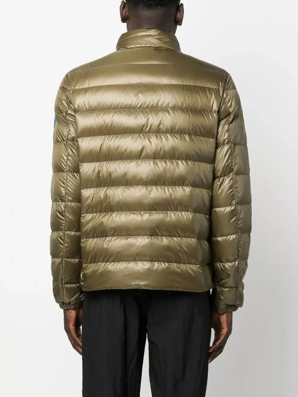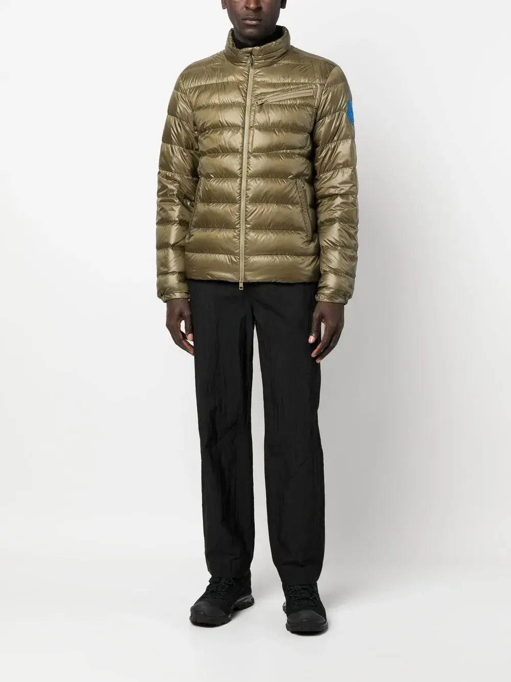 Зеленый, наполнитель из пуха и перьев, дутый материал, воротник-труба, длинные рукава и застежка на молнии спереди.