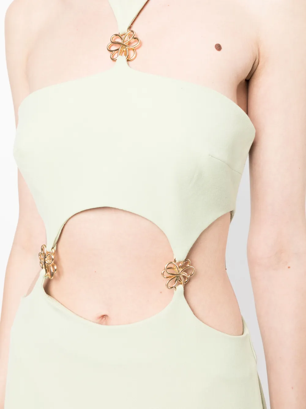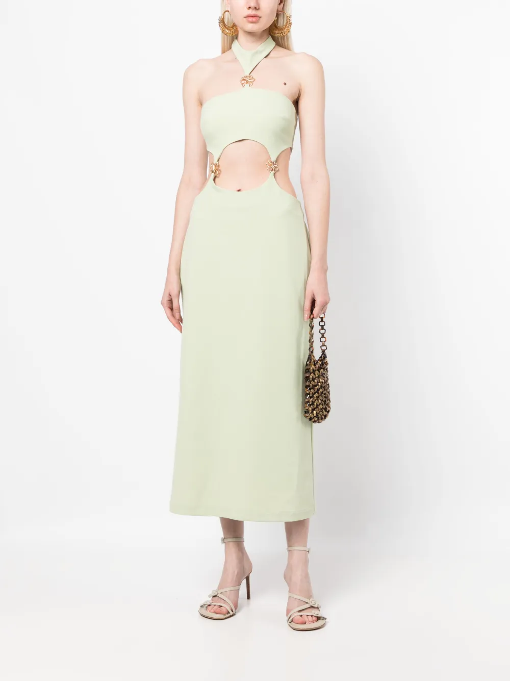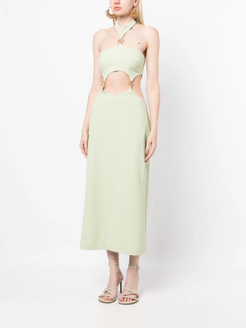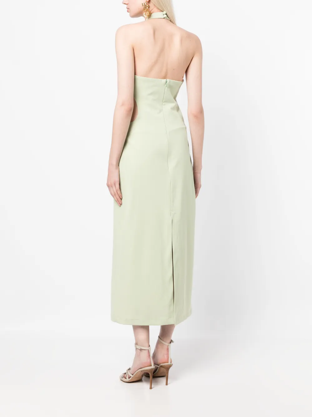 Светло-зеленый, креповая текстура, вырезные детали, золотистая фурнитура, вырез-петля халтер, застежка на молнии сзади, без рукавов и длина до середины голени.