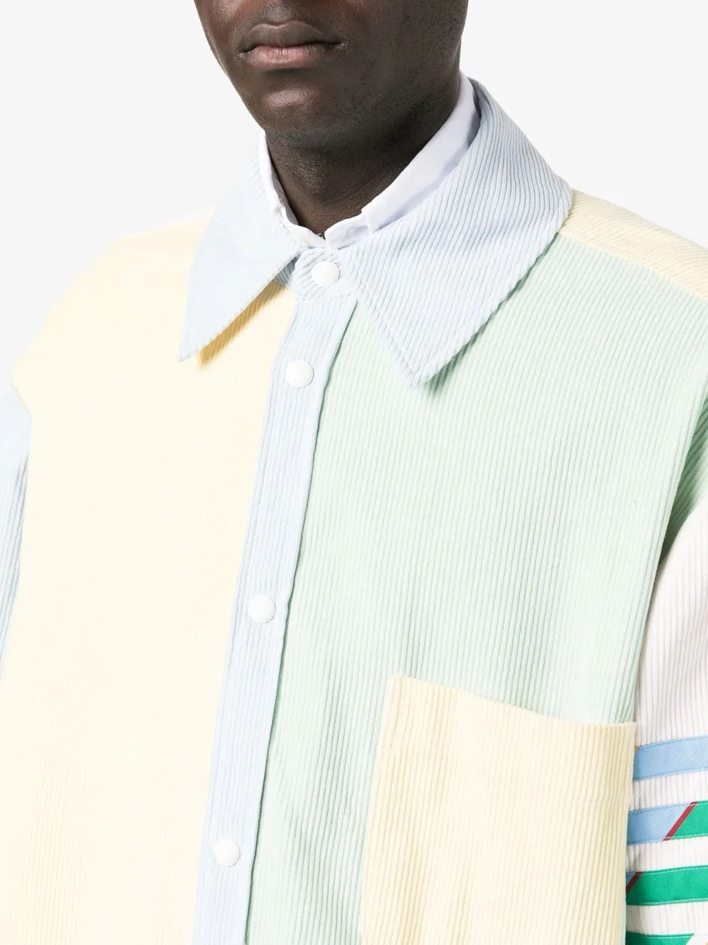 Разноцветный, хлопок, вставки, узор в тонкую полоску, классический воротник, нагрудный накладной карман, застежка на пуговицах спереди, рукава с манжетами, полоски и закругленный подол.
