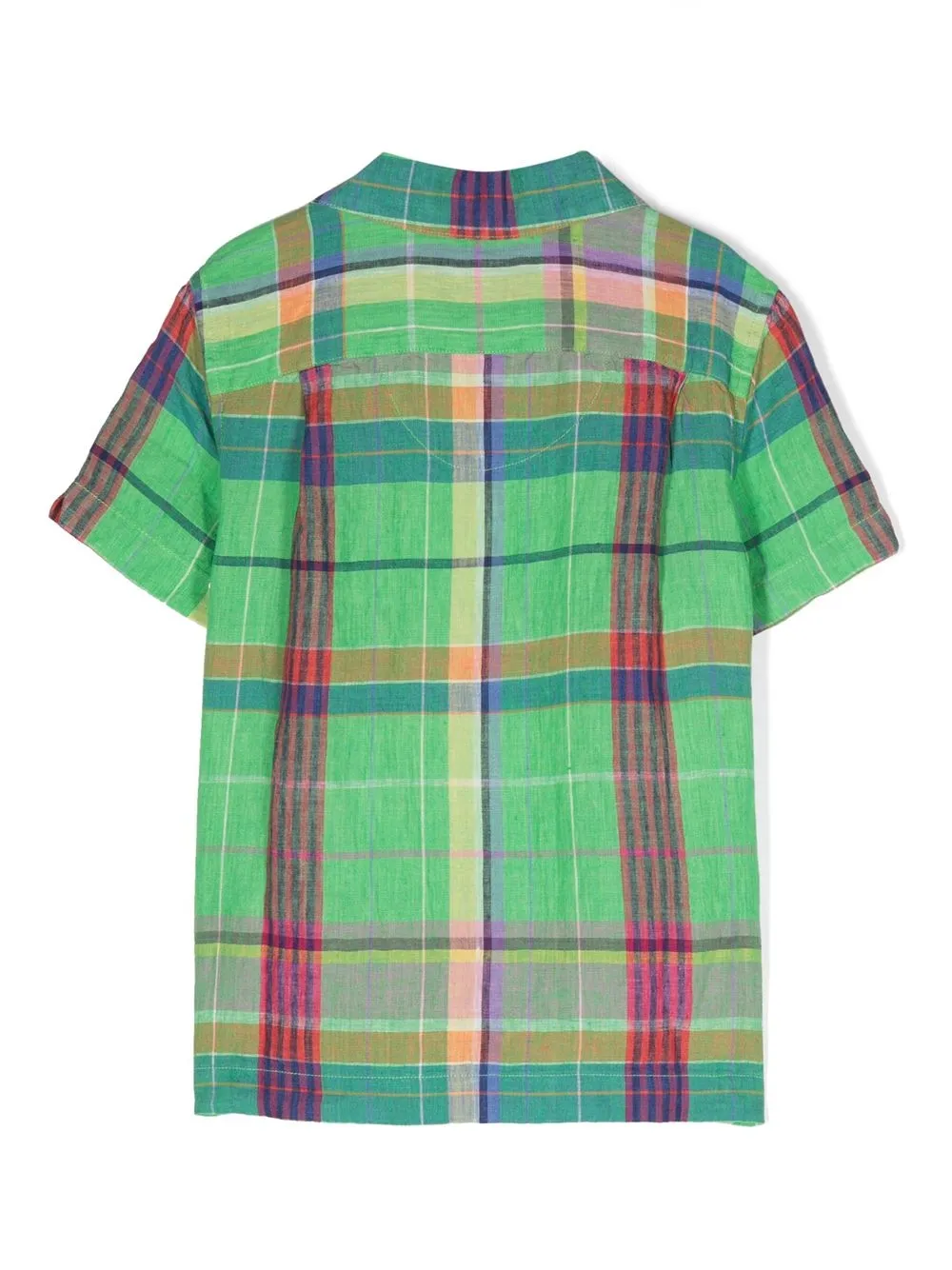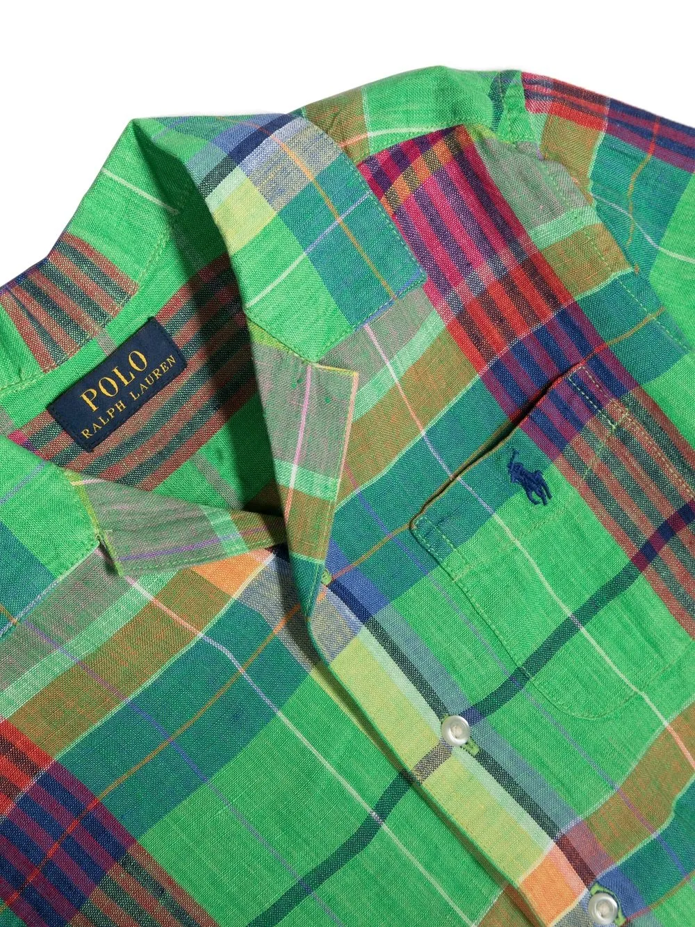 Ярко-зеленый, разноцветный, лен, клетчатый узор, знаковый логотип Polo Pony, отложный воротник, застежка на пуговицах спереди, накладной карман спереди, короткие рукава и прямой подол. Ответственный выбор: Этот товар как минимум на 50% состоит из материалов, которые признаны более безопасными для окружающей среды или сертифицированы независимыми организациями.