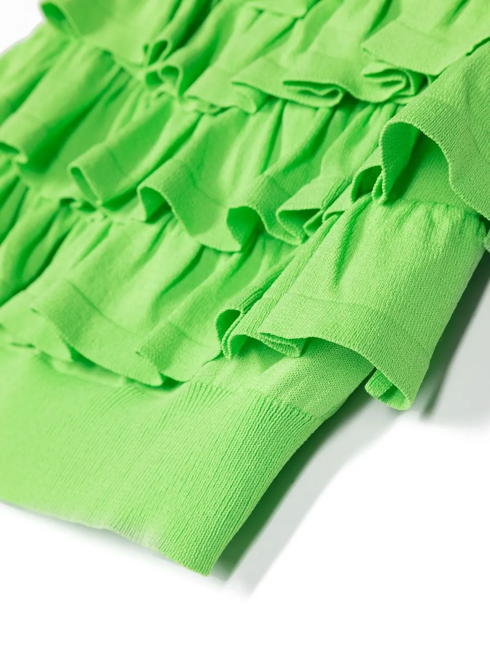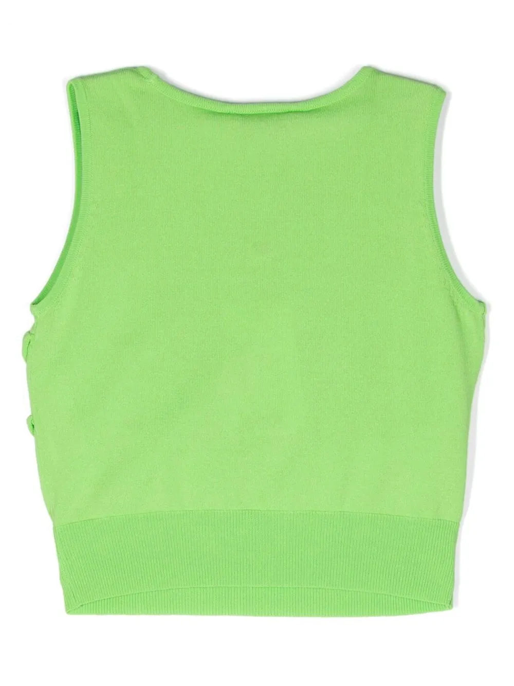 Расцветка Grass Green, трикотаж в рубчик, золотистый металлический логотип, дизайн со сборками, без рукавов и подол в рубчик.