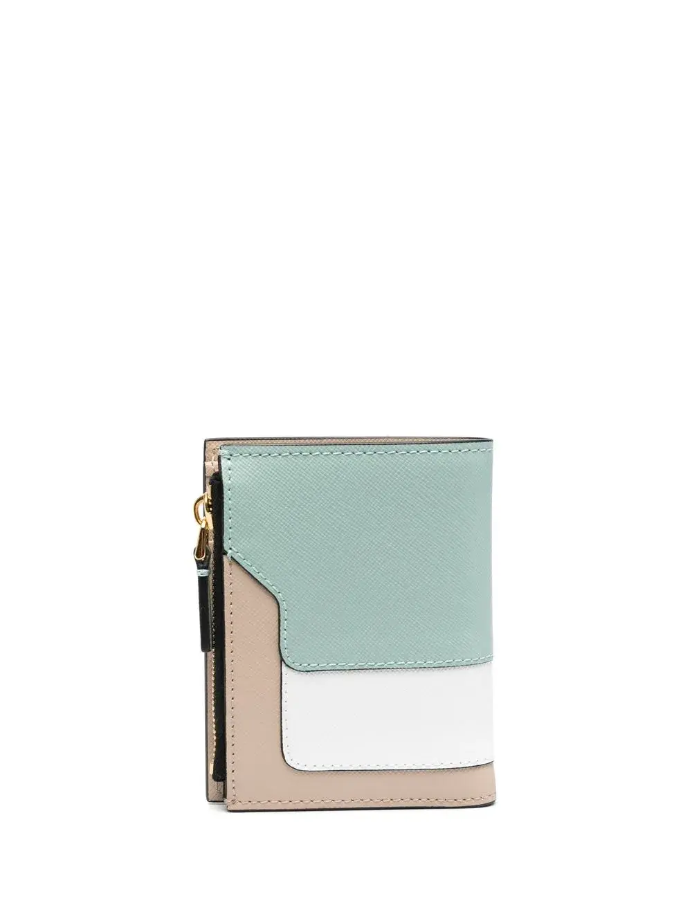 Телячья кожа, зернистая текстура, стиль колор-блок, золотистый логотип, два сложения, застежка на кнопках, карман на молнии, внутренние отделения для карт и отделение для купюр.